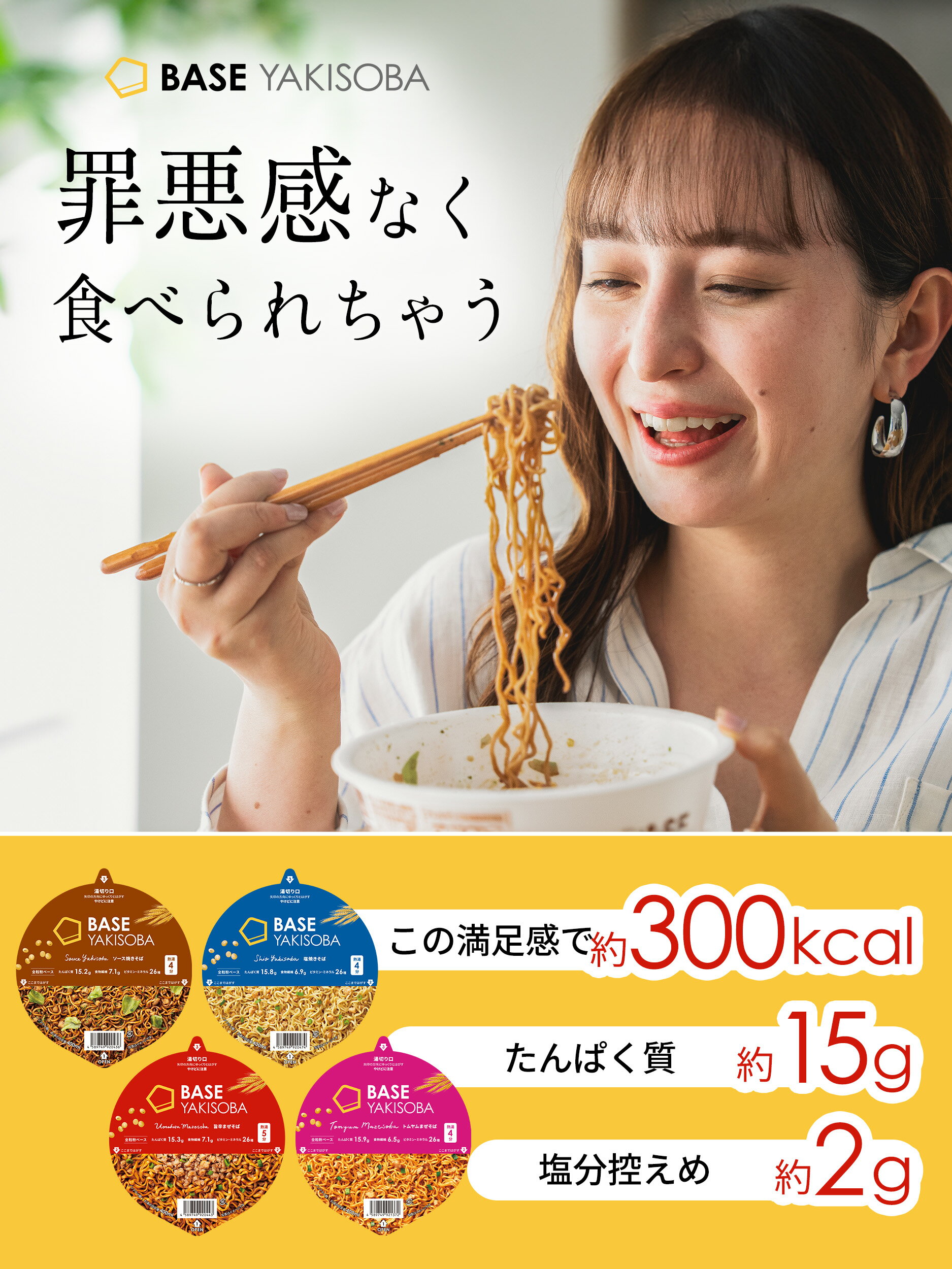 商品名 【BASE YAKISOBA】 塩焼きそば 商品区分 家庭用 内容量 1個 83g(めん65g) ユニット数 2個 原材料 めん〔小麦全粒粉(国内製造)、小麦たんぱく、小麦粉、大豆粉、還元水飴、米ぬか粉、植物油脂、海藻粉末、ドロマイト、粉末油脂、昆布粉末、酵母〕、添付調味料(植物油脂、砂糖、食塩、香辛料、チキンエキス、たんぱく加水分解物、ほたてエキス、粉末しょうゆ)、かやく(粒状大豆たんぱく、ネギ)/加工でん粉、調味料(アミノ酸等)、かんすい、乳化剤、V.C、酸味料、カラメル色素、V.E、ナイアシン、パントテン酸Ca、V.B1、V.B6、V.B2、V.A、葉酸、V.D、V.B12、(一部に小麦・大豆・鶏肉を含む) アレルギー表示 小麦・大豆・鶏肉 賞味期限 お届け希望日から約2ヶ月 温度帯 常温 販売者 ベースフード株式会社 東京都目黒区中目黒5-25-2 製造者 商品説明 スパイスが引き立つ、あっさりな味わいの塩焼きそば。 商品名 【BASE YAKISOBA】 旨辛まぜそば 商品区分 家庭用 内容量 1個 83g(めん65g) ユニット数 2個 原材料 めん〔小麦全粒粉(国内製造)、小麦たんぱく、小麦粉、大豆粉、還元水飴、米ぬか粉、植物油脂、海藻粉末、ドロマイト、粉末油脂、昆布粉末、酵母〕、添付調味料(植物油脂、砂糖、食塩、香辛料、デキストリン、粉末みそ、調味油脂、酵母エキスパウダー、シーズニングパウダー、粉末しょうゆ)、かやく(粒状大豆たんぱく、ネギ)/加工でん粉、調味料(アミノ酸等)、かんすい、乳化剤、酸味料、V.C、カラメル色素、V.E、ナイアシン、パントテン酸Ca、V.B1、V.B6、V.B2、V.A、葉酸、V.D、V.B12、(一部に小麦・大豆・鶏肉・豚肉・ごまを含む) アレルギー表示 小麦・大豆・鶏肉・豚肉・ごま 賞味期限 お届け希望日から約2ヶ月 温度帯 常温 販売者 ベースフード株式会社 東京都目黒区中目黒5-25-2 製造者 商品説明 旨辛スパイスの汁なし辛麺。毎日でも食べたくなるクセのないおいしさ。 商品名 【BASE YAKISOBA】 ソース焼きそば 商品区分 家庭用 内容量 1個 86g(めん65g) ユニット数 2個 原材料 めん〔小麦全粒粉(国内製造)、小麦たんぱく、小麦粉、大豆粉、還元水飴、米ぬか粉、植物油脂、海藻粉末、ドロマイト、粉末油脂、昆布粉末、酵母〕、添付調味料(植物油脂、砂糖、食塩、粉末ソース、香辛料、あおさ、粉末しょうゆ、ポークエキス)、かやく(粒状大豆たんぱく、キャベツ)/加工でん粉、調味料(アミノ酸等)、カラメル色素、かんすい、乳化剤、酸味料、V.C、V.E、ナイアシン、パントテン酸Ca、V.B1、V.B6、V.B2、V.A、葉酸、V.D、V.B12、(一部に小麦・大豆・豚肉・ごまを含む) アレルギー表示 小麦・大豆・豚肉・ごま ※本製品に使用しているあおさはエビ、カニが混ざる漁法で捕獲しています。 賞味期限 お届け希望日から約2ヶ月 温度帯 常温 販売者 ベースフード株式会社 東京都目黒区中目黒5-25-2 製造者 商品説明 香ばしいソースがどこか懐かしく飽きのこないソース焼きそば。カロリー控えめでやさしい味わい。 商品名 【BASE YAKISOBA】 トムヤムまぜそば 商品区分 家庭用 内容量 1個 78g(めん65g) ユニット数 2個 原材料 めん〔小麦全粒粉(国内製造)、小麦たんぱく、小麦粉、大豆粉、還元水飴、米ぬか粉、植物油脂、海藻粉末、ドロマイト、昆布粉末、酵母、粉末油脂〕、添付調味料〔植物油脂、食塩、乳等を主要原料とする食品、香辛料、砂糖、エビ調味料粉末、たんぱく加水分解物、エビエキスパウダー、粉末調味料、魚醤パウダー(魚介類)〕、かやく(粒状大豆たんぱく、ネギ)/加工でん粉、調味料(無機塩等)、かんすい、乳化剤、酸味料、V.C、着色料(カロチノイド、カラメル)、香料、V.E、ナイアシン、パントテン酸Ca、V.B1 、V.A、V.B6、V.B2、葉酸、V.D、V.B12、(一部にえび・小麦・乳成分・大豆・鶏肉・ゼラチン・魚醤パウダー(魚介類)を含む) アレルギー表示 えび・小麦・乳成分・大豆・鶏肉・ゼラチン・魚醤パウダー(魚介類) 賞味期限 お届け希望日から約2ヶ月 温度帯 常温 販売者 ベースフード株式会社 東京都目黒区中目黒5-25-2 製造者 商品説明 エスニックが、香る、絡む、クセになる。 完全栄養食 ※1食分(2個)で、栄養素等表示基準値に基づき、脂質・飽和脂肪酸・炭水化物・ナトリウム以外のすべての栄養素で1日分の基準値の1/3以上を含む。