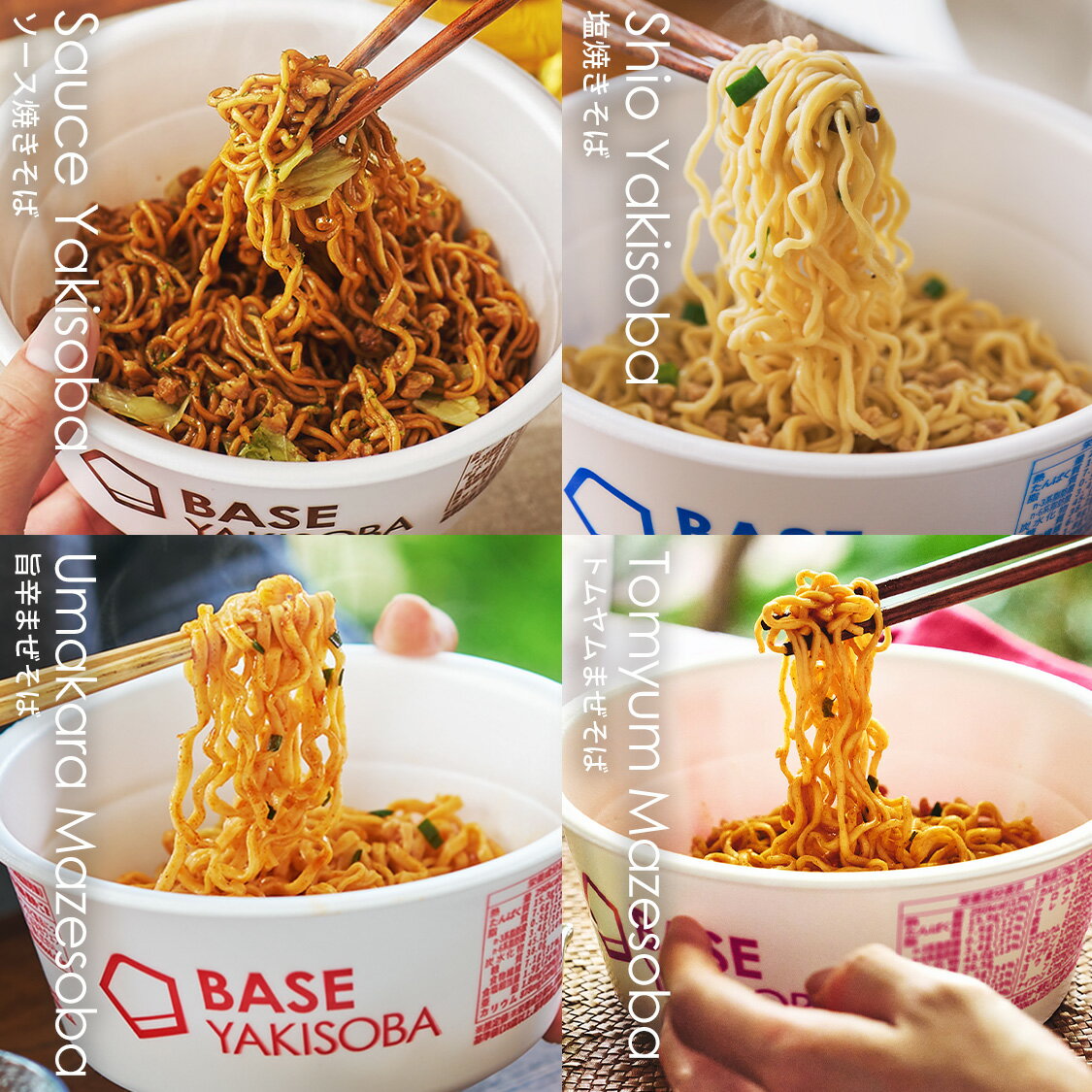 ベース焼きそば カップ麺 4種8個【トムヤムまぜそば・塩焼きそば・旨辛まぜそば・ソース焼きそば】置き換えダイエット ダイエット食品 完全栄養食 たんぱく質 長期保存 塩分ひかえめ ベースフード BASE FOOD