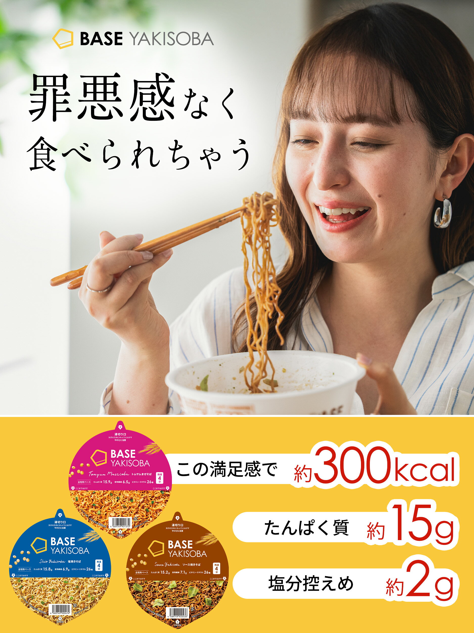 商品名 【BASE YAKISOBA】 塩焼きそば 商品区分 家庭用 内容量 1個 83g(めん65g) ユニット数 2個 原材料 めん〔小麦全粒粉(国内製造)、小麦たんぱく、小麦粉、大豆粉、還元水飴、米ぬか粉、植物油脂、海藻粉末、ドロマイト、粉末油脂、昆布粉末、酵母〕、添付調味料(植物油脂、砂糖、食塩、香辛料、チキンエキス、たんぱく加水分解物、ほたてエキス、粉末しょうゆ)、かやく(粒状大豆たんぱく、ネギ)/加工でん粉、調味料(アミノ酸等)、かんすい、乳化剤、V.C、酸味料、カラメル色素、V.E、ナイアシン、パントテン酸Ca、V.B1、V.B6、V.B2、V.A、葉酸、V.D、V.B12、(一部に小麦・大豆・鶏肉を含む) アレルギー表示 小麦・大豆・鶏肉 賞味期限 お届け希望日から約2ヶ月 温度帯 常温 販売者 ベースフード株式会社 東京都目黒区中目黒5-25-2 製造者 商品説明 スパイスが引き立つ、あっさりな味わいの塩焼きそば。 商品名 【BASE YAKISOBA】 トムヤムまぜそば 商品区分 家庭用 内容量 1個 78g(めん65g) ユニット数 2個 原材料 めん〔小麦全粒粉(国内製造)、小麦たんぱく、小麦粉、大豆粉、還元水飴、米ぬか粉、植物油脂、海藻粉末、ドロマイト、昆布粉末、酵母、粉末油脂〕、添付調味料〔植物油脂、食塩、乳等を主要原料とする食品、香辛料、砂糖、エビ調味料粉末、たんぱく加水分解物、エビエキスパウダー、粉末調味料、魚醤パウダー(魚介類)〕、かやく(粒状大豆たんぱく、ネギ)/加工でん粉、調味料(無機塩等)、かんすい、乳化剤、酸味料、V.C、着色料(カロチノイド、カラメル)、香料、V.E、ナイアシン、パントテン酸Ca、V.B1、V.A、V.B6、V.B2、葉酸、V.D、V.B12、(一部にえび・小麦・乳成分・大豆・鶏肉・ゼラチン・魚醤パウダー(魚介類)を含む) アレルギー表示 えび・小麦・乳成分・大豆・鶏肉・ゼラチン・魚醤パウダー(魚介類) 賞味期限 お届け希望日から約2ヶ月 温度帯 常温 販売者 ベースフード株式会社 東京都目黒区中目黒5-25-2 製造者 商品説明 エスニックが、香る、絡む、クセになる。 商品名 【BASE YAKISOBA】 ソース焼きそば 商品区分 家庭用 内容量 1個 86g(めん65g) ユニット数 2個 原材料 めん〔小麦全粒粉(国内製造)、小麦たんぱく、小麦粉、大豆粉、還元水飴、米ぬか粉、植物油脂、海藻粉末、ドロマイト、粉末油脂、昆布粉末、酵母〕、添付調味料(植物油脂、砂糖、食塩、粉末ソース、香辛料、あおさ、粉末しょうゆ、ポークエキス)、かやく(粒状大豆たんぱく、キャベツ)/加工でん粉、調味料(アミノ酸等)、カラメル色素、かんすい、乳化剤、酸味料、V.C、V.E、ナイアシン、パントテン酸Ca、V.B1、V.B6、V.B2、V.A、葉酸、V.D、V.B12、(一部に小麦・大豆・豚肉・ごまを含む) アレルギー表示 小麦・大豆・豚肉・ごま ※本製品に使用しているあおさはエビ、カニが混ざる漁法で捕獲しています。 賞味期限 お届け希望日から約2ヶ月 温度帯 常温 販売者 ベースフード株式会社 東京都目黒区中目黒5-25-2 製造者 商品説明 香ばしいソースがどこか懐かしく飽きのこないソース焼きそば。カロリー控えめでやさしい味わい。 完全栄養食 ※1食分(2個)で、栄養素等表示基準値に基づき、脂質・飽和脂肪酸・炭水化物・ナトリウム以外のすべての栄養素で1日分の基準値の1/3以上を含む。