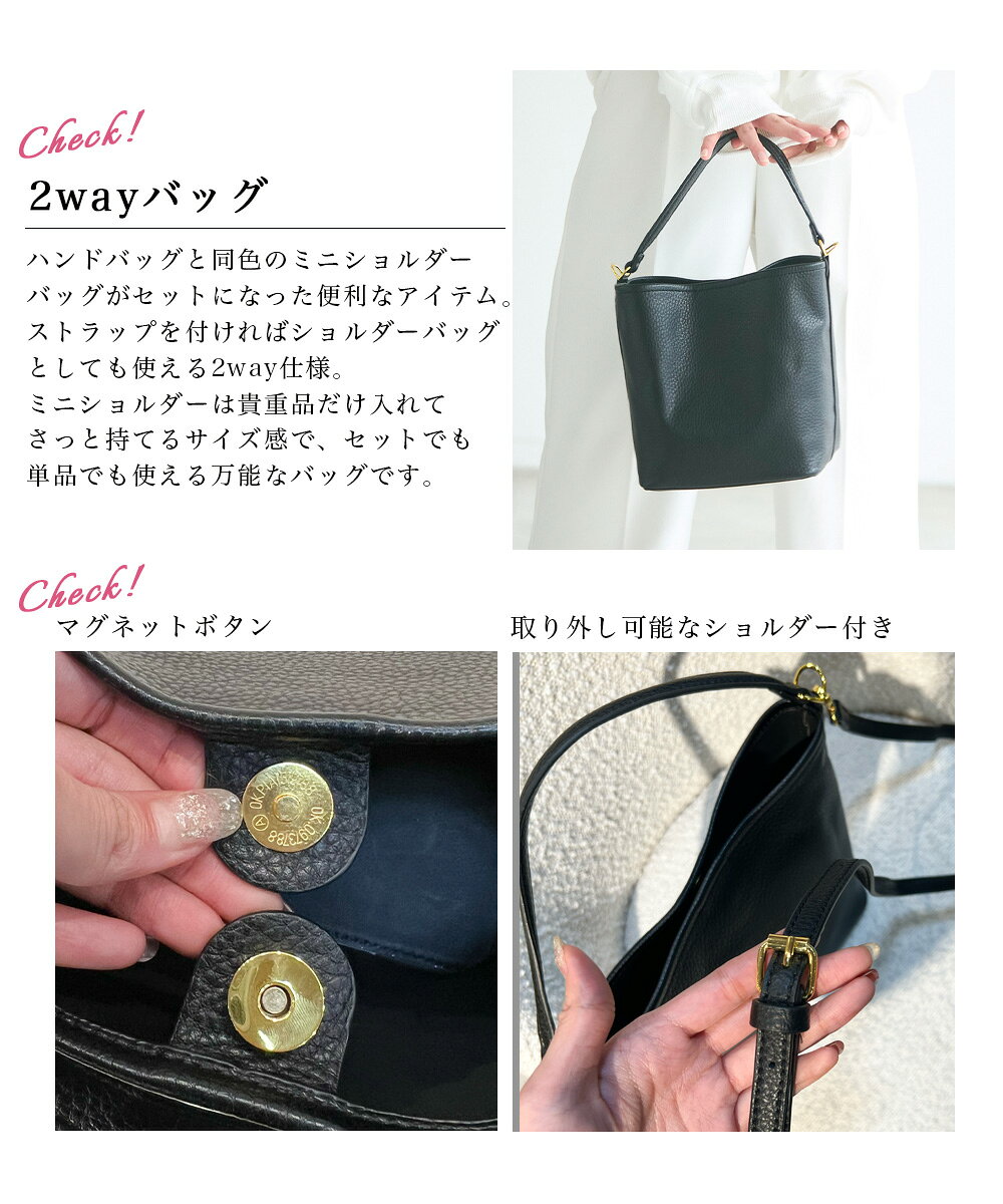サイズ バケツバッグ:高さ 約20cm/底横幅 約17.5cm/入口幅 約26cm/奥行き 約12cm/ハンドル 約33cm/ショルダー 約92~108cm,ミニポシェット:高さ 約14cm/底横幅 約15cm/入口幅 約17cm/奥行き 約7.5cm/ショルダー 約119cm 素材 表地/裏地/持ち手:合成皮革100% 重量 バケツバッグ本体約280g,ポシェット約170g 注意事項 ※パソコンモニターまたは撮影ライトや自然光での光の影響により、画像によって実際の商品の素材感や色の差を感じることがございます。 ※素材の特性上臭いが強い場合がございます。数日のご使用や陰干しなどで気になる匂いはほとんど感じられなくなりますが、ご理解いただいた上でのご購入をお願いいたします。 ※この商品は生地の特性上、摩擦されると他に色が移ることがあります。淡色のものとコーディネートやバッグ、靴類の色移りにご注意ください。 ※生産時期が異なる場合やロットの違いによって、多少生地の色や質感の違いがございますのであらかじめご了承ください。 ※湿った状態での摩擦や雨、汗でぬれた際には他の衣料等に色が移ることがございます。 生産国 made in chinaカラフルバケツバッグ