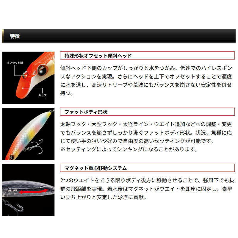 商品説明商品説明納期:1〜2日予定(土日祝水曜を除く)セレクティブな状況で喰わせるサイズ。津留崎のワールドスタンダードミノー、ダウンサイジングモデル。キビナゴなどの小型ベイトのサイズにベストマッチし、オリジナルサイズではシビアな状況で小技を駆使して口を使わせる、トゥルーラウンド115Fのダウンサイジングモデル。オリジナル同様、荒天を切り裂きライナー弾道でカッ飛ぶ驚異的な飛行性能を持ち、着水後は2つのウエイトを即座に固定。素早い立ち上がりでチャンスを逃しません。リップレスミノーとリップ付きミノーの特性をいいとこ取りした特殊形状オフセット傾斜ヘッドは、安定したタイトなウィグルアクションを発生させ、低速から高速リトリーブまで少々の荒波でもしっかりアピール。太軸フック・大型フック・太径ライン・ウエイト追加などへの調整・変更を前提にしたボディバランスは世界で活躍する津留崎のこだわりです。 商品詳細スペック■全長:9.4cm■自重:10.5g■タイプ:スローフローティング■潜行レンジ:0.8〜1.5m■リング(スナップ)サイズ:【フックアイ】 フロント:#3・リア:#3■フックサイズ:フロント:#5・リア:#5