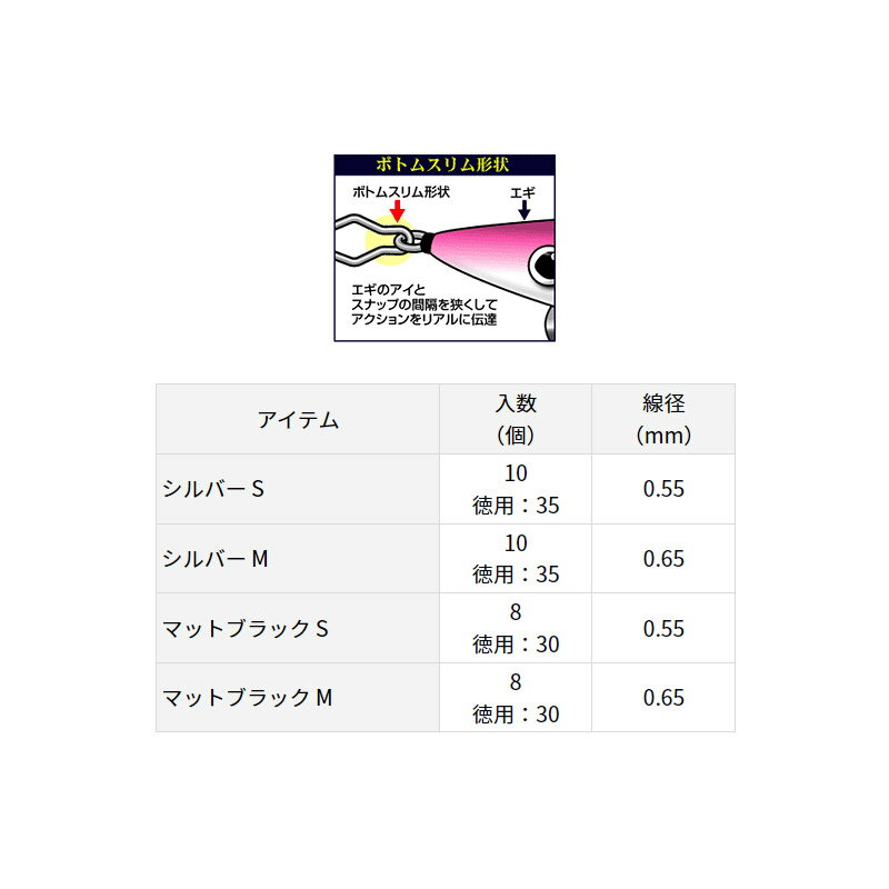 商品説明商品説明納期:2〜4日予定(土日祝水曜を除く)お取寄せでのご発送シャクリ・ダートなどのアクションをリアルにエギに伝達するエギング専用スナップ■取り付けやすく、外れ難いスナップ形状フック部を大きくし、内向き曲げることでシャクリやダート時の衝撃によるはずれを防ぎます。■ステンレス製で錆びにくく、高強度を維持。(耐引張り最大加重約15kg)耐腐食に強く、伸縮性に富んだステンレス素材使用(304)メガセンサー2号の直線強力14.6kgに対し耐引張り強度16kgと十分な強度を保持■エギのアイにアクションをリアルに伝えるボトムスリム形状エギのアイとスナップの間隔を狭くし、ラインを通じて来るアクションをリアルにエギに伝えるボトムスリム形状。用途に応じて選べるシルバー、マットブラックの2カラーをラインナップ。※マットブラックについては、ご使用状況によって若干色落ちする場合がございます。商品詳細スペック■入り数:シルバー 35、マットブラック 30■線径(mm):0.55mm掲載在庫と発送納期について掲載の在庫状況につきましては、当社及び取引先の在庫状況を反映致しております。ご注文タイミングにより当社在庫又はお取り寄せにてご用意させていただいております。また他の当社WEBサイトと在庫を共有も致しております。万一当社メーカー共に在庫欠品の場合には、ご連絡の上キャンセルさせていただく事がありますので予めご了承いただきます様お願い致します。商品のご発送は当社受付より2〜4営業日(土日祝水曜を除く)程で行わせていただいております。商品がお取り寄せとなりました場合でも、2〜7日営業日(土日祝水曜を除く)程ではご発送出来る様に努めさせていただいております。お急ぎの際は事前にお問合わせ下さい。 沖縄県を含む離島地域へのご発送送料について沖縄県全域及び配送業者の定めます離島部に該当する地域につきましては、お荷物のサイズにより追加送料が発生致します。送料無料商品、購入金額による送料サービスにつきましては対象外とさせていただきます。追加送料を含んだ合計金額につきましては、当社受付後にEメールにてご案内させていただきます。尚、メール便でのご発送につきましては他の地域と同一料金、サービスにてご利用いただけます。 ご注文前にご確認をお願い致しますm(__)m本商品はご注文タイミングやご注文内容によっては、購入履歴からのご注文キャンセル、修正を受け付けることができない場合がございます。配送方法は、システム上全ての商品でメール便が選択出来ますが、商品名に メール便配送可 と記載の無い商品が1点でも含まれますとメール便でのご発送は出来ません。ご案内のEメールは必ず送信しておりますが、一括送信を行う為、受信環境やメールソフト、ウィルス対策により受信いただけない場合もございます。迷惑メール等もご確認の上、ご不明の際はお手数ですがお問い合わせいただきます様お願い致します。