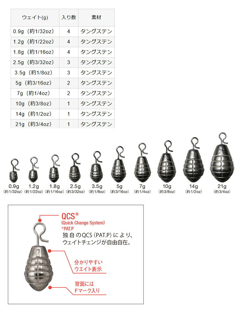 商品説明商品説明納期:2〜4日予定(土日祝水曜を除く)お取寄せでのご発送独自のQCSにより、ウェイトチェンジが自由自在のタングステンシンカー。手榴弾をイメージした特殊形状により、カバーへの侵入能力は秀逸。抜群の底取り感の良さから、超高感度を実現。スルーリグやスルダンとの相性が抜群で、果敢に障害物を狙った釣法で非常に高い効果を発揮。素材は高比重の焼結タングステンを採用。※JB・NBCエコタックル認定商品。商品詳細スペック■サイズ:5g(約3/16oz)■入り数:2個■素材:タングステン掲載在庫と発送納期について掲載の在庫状況につきましては、当社及び取引先の在庫状況を反映致しております。ご注文タイミングにより当社在庫又はお取り寄せにてご用意させていただいております。また他の当社WEBサイトと在庫を共有も致しております。万一当社メーカー共に在庫欠品の場合には、ご連絡の上キャンセルさせていただく事がありますので予めご了承いただきます様お願い致します。商品のご発送は当社受付より2〜4営業日(土日祝水曜を除く)程で行わせていただいております。商品がお取り寄せとなりました場合でも、2〜7日営業日(土日祝水曜を除く)程ではご発送出来る様に努めさせていただいております。お急ぎの際は事前にお問合わせ下さい。 沖縄県を含む離島地域へのご発送送料について沖縄県全域及び配送業者の定めます離島部に該当する地域につきましては、お荷物のサイズにより追加送料が発生致します。送料無料商品、購入金額による送料サービスにつきましては対象外とさせていただきます。追加送料を含んだ合計金額につきましては、当社受付後にEメールにてご案内させていただきます。尚、メール便でのご発送につきましては他の地域と同一料金、サービスにてご利用いただけます。 ご注文前にご確認をお願い致しますm(__)m本商品はご注文タイミングやご注文内容によっては、購入履歴からのご注文キャンセル、修正を受け付けることができない場合がございます。配送方法は、システム上全ての商品でメール便が選択出来ますが、商品名に メール便配送可 と記載の無い商品が1点でも含まれますとメール便でのご発送は出来ません。ご案内のEメールは必ず送信しておりますが、一括送信を行う為、受信環境やメールソフト、ウィルス対策により受信いただけない場合もございます。迷惑メール等もご確認の上、ご不明の際はお手数ですがお問い合わせいただきます様お願い致します。