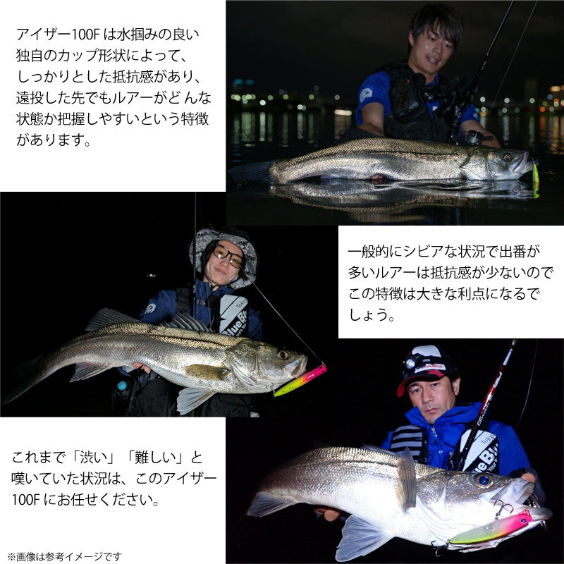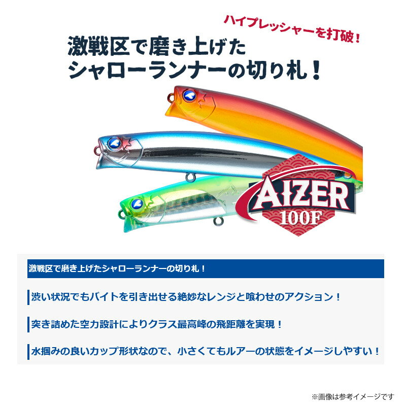 商品説明商品説明納期:1〜2日予定(土日祝水曜を除く)激戦区で磨き上げたシャローランナーの切り札!●渋い状況でもバイトを引き出せる絶妙なレンジと喰わせのアクション!●突き詰めた空力設計によりクラス最高峰の飛距離を実現!●水掴みの良いカップ形状なので、小さくてもルアーの状態をイメージしやすい!ハイプレッシャーを打破!アイザー100F はプレッシャーが高い激戦区や、ベイトが小さく渋い状況で真価を発揮するシャローランナーです。「魚は居るけど、喰わない」この状況を打破するためには、弱ったベイトが流されながら漂っているアクションがとても 効果的です。アイザー100F はそのアクションを徹底的に追及しました。水面下20cm 以内の絶妙なレンジを弱弱しいア クションでゆっくり漂わせることができるので、誰でも簡単にバイトを誘発できます。また、突き詰めたボディ設計 と重心バランスにより、安定した飛行姿勢を実現しました。これによって10cmとは思えない飛距離を体感できます。商品詳細スペック■全長:100mm■重さ:13.5g■リング:#3■フック:#5×2■レンジ:5-20cm掲載在庫と発送納期について掲載の在庫状況につきましては、当社及び取引先の在庫状況を反映致しております。ご注文タイミングにより当社在庫又はお取り寄せにてご用意させていただいております。また他の当社WEBサイトと在庫を共有も致しております。万一当社メーカー共に在庫欠品の場合には、ご連絡の上キャンセルさせていただく事がありますので予めご了承いただきます様お願い致します。商品のご発送は当社受付より2〜4営業日(土日祝水曜を除く)程で行わせていただいております。商品がお取り寄せとなりました場合でも、2〜7日営業日(土日祝水曜を除く)程ではご発送出来る様に努めさせていただいております。お急ぎの際は事前にお問合わせ下さい。 沖縄県を含む離島地域へのご発送送料について沖縄県全域及び配送業者の定めます離島部に該当する地域につきましては、お荷物のサイズにより追加送料が発生致します。送料無料商品、購入金額による送料サービスにつきましては対象外とさせていただきます。追加送料を含んだ合計金額につきましては、当社受付後にEメールにてご案内させていただきます。尚、メール便でのご発送につきましては他の地域と同一料金、サービスにてご利用いただけます。 ご注文前にご確認をお願い致しますm(__)m本商品はご注文タイミングやご注文内容によっては、購入履歴からのご注文キャンセル、修正を受け付けることができない場合がございます。配送方法は、システム上全ての商品でメール便が選択出来ますが、商品名に メール便配送可 と記載の無い商品が1点でも含まれますとメール便でのご発送は出来ません。ご案内のEメールは必ず送信しておりますが、一括送信を行う為、受信環境やメールソフト、ウィルス対策により受信いただけない場合もございます。迷惑メール等もご確認の上、ご不明の際はお手数ですがお問い合わせいただきます様お願い致します。