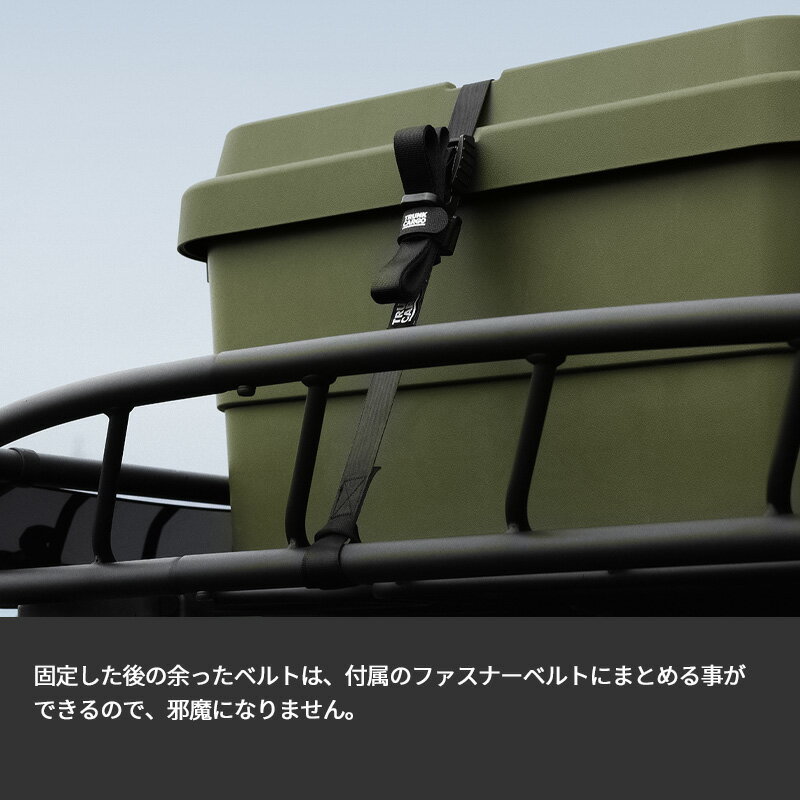 ■Detail -商品説明- トランクカーゴの車載に特化した固定ベルト。効率のいい固定と荷解きができることを追求し、ルーフキャリアをさらに快適に使用できるようになりました。 ■Delivery -配送に関して- ●北海道・沖縄・離島は追加送料がかかります。注文確認後、送料修正しご案内いたします。 ≫送料・配送についての詳細はこちらから ■attention -注意事項- ●お客様都合の返品・交換はお受けしておりません。→詳しくはこちら ●注文段階では、[送料],[金額変更等]が正しく計算されない場合がございます。後ほど当店よりお送りするメールにてご確認ください。 ●画面上写真と実際の商品の色が多少異なる場合があります。TRUNK CARGO / トランクカーゴ ルーフキャリアベルト 効率の良い固定と荷解きができることを追求した、トランクカーゴの車載に特化した固定ベルト。2本のベルトで固定するカムバックル式で簡単に荷物の固定ができ、作業時間を短縮できます。固定した後のベルトの余り、使わない時はきれいにまとめておけるファスナーバンドも付属。車でアウトドアやレジャーに出かけることが多い方におすすめのアイテムです。 車載する荷物をしっかり固定 効率よく作業がすすむ ルーフキャリアベルト ルーフキャリアベルトは、荷物車載の負担を軽減することを考えて開発されました。先端が輪になった2本のベルトで留めるカムバックル式を採用。荷物の固定手順が少なくなり、手間のかかる荷留めもスムーズに終わります。 余ったベルトも すっきりとまとまる 専用バンド付き 固定して余ったベルトは、付属のファスナーバンドでまとめる事で邪魔になりません。使い終わった後の長いベルトもまとめておけるので、省スペースにすっきりと後片付けすることができます。 大切な車を 傷つけない工夫 カムバックルを覆うPVC製のカバーによって、車への傷つき対策がされています。取り付け時にバックルを落としてしまっても車体を傷つけにくいので、安心してお使いいただけます。 ベルトの取り付け方 車にトランクカーゴを載せてお出かけする時に便利なルーフキャリアベルト。荷物の固定も荷解きも効率よくでき、ルーフキャリアをさらに快適に使用できるようになります。 詳しい取り付け方はページ内の動画でもご確認いただけます。 トランクカーゴ バリエーション 20S容量 22L 30S容量 30L 50S容量 50L 70S容量 70L 30S LOW容量 18L 50S LOW容量 30L 70S LOW容量 40L 仕切板LOW ルーフキャリアベルト 20S 30S 50S 70S ●商品の詳細● 品 名 トランクカーゴ ルーフキャリアベルト サイズ 外寸:約 幅2725 × 奥行き44 × 高さ30mm(ベルトの幅:25mm) 長さ:ベルトS(バックル付き) 0.4m・ベルトL 2.3m 破断荷重 約 280kgf 使用荷重 約 70kg 材 質 ポリエステル、PVC、POM 重 量 約 134g カラー ブラック 入 数 1個 備 考 日本製 ■注意点 ※製品のサイズをご確認のうえ、ご注文ください。 ※商品の色は、画面上の画像と実物とでは多少異なる場合がございます。色・イメージが違う等の理由による返品は一切お受けできません。予めご了承ください。