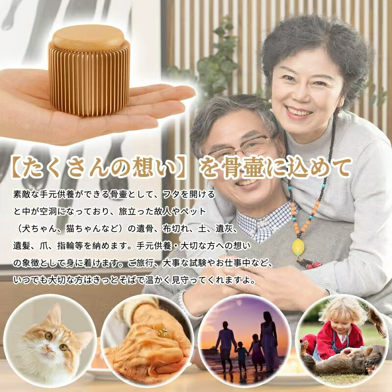 商品情報商品名ミニ骨壷-円筒形商品キーワード骨壺;骨壷 ミニ;ミニ骨壷 手元供養;骨壺 ミニ ペット;ミニ骨壺 分骨;分骨用 骨壷;手元供養 仏壇;分骨入れ骨壺サイズ外寸法:直径6.5cm×高さ5.5cm内寸法:直径4.0cm×高さ約3.5cm重量:160 g1gの計量スプーンと15~20g透明ボトル付き高品質の透明ボトル付きで、遺骨は金属材料に直接接触しません。材質アルミ製+天然木ブナ材色シャンパン/シルバー/スカイグレー💟【分骨用や手元供養用の小さい骨壺】お墓が遠くてなかなかお参りに行けない方、分骨して一部を手元に置いて、場所を取らず、ずっと置いておけます。手元供養・大切な方への想いの象徴として保管いたします。💟【優れた密封型骨壺セット 遺骨がこぼれない】蓋には二重層のデザインがあり、遺骨がこぼれることはありません。蓋もボルトも二重保護で、防塵、湿気を防ぐ、こぼれ防止、きれいに見せる、取り出しやすい、なお丸形なので安定性が高くて、倒れて壊れる心配がありません。蓋の上に思い出の記念品を乗せて一緒に納めておくことができます。💟【多用途 メモリアル】ご家族やペットでの分骨、お寺の納骨壇への分骨、いつまでも傍に置いておきたい手元供養に最適です。フタを開けると中が空洞になっており、旅立った故人、故人様の指輪やペット(犬ちゃん、猫ちゃんなど)の遺骨、布切れ、土、遺灰、遺髪、爪等を納めます。愛と希望を表し、仏壇と合わせて、亡くなった人への限りない思いと善意をも表しています。💟【場所を問わず】和室、洋風にも違和感なく、置く場所に困らないお洒落なデザインのミニ骨壷です。お好きの所に置いていて、より一層故人様を傍にいつでも感じなれます。💟【美しいボックス付き】きれいに包装していて、親しい友人へのプレゼントにも最適!ご注意:★手動測定による1~2cmの誤差を許容してください。ご理解いただきありがとうございます※大切なご家族の一員であるペットのご供養にも、ぜひお使いください。★ 万一何らかのご不満や不良品が生じた場合、何時でもお気軽にご連絡ください。無料交換や返品・返金対応させていただきます。【軽量・防錆】骨壺 ミニ骨壷 手元供養 アルミニウム製 コンパクト骨壺 分骨 骨灰入れ ペット 小型 密閉式 仏壇用 身近に感じる永遠保存「Eternal Mini」【時間限定★送料無料】 【大切な家族とペットの思い出を、ずっと身近に】手元供養 ミニ骨壺 【優れた密封型の骨壺-大切な人とペット、いつも一緒に】 ※大切なご家族の一員であるペットのご供養にも、ぜひお使いください。★ 万一何らかのご不満や不良品が生じた場合、何時でもお気軽にご連絡ください。無料交換や返品・返金対応させていただきます。 3