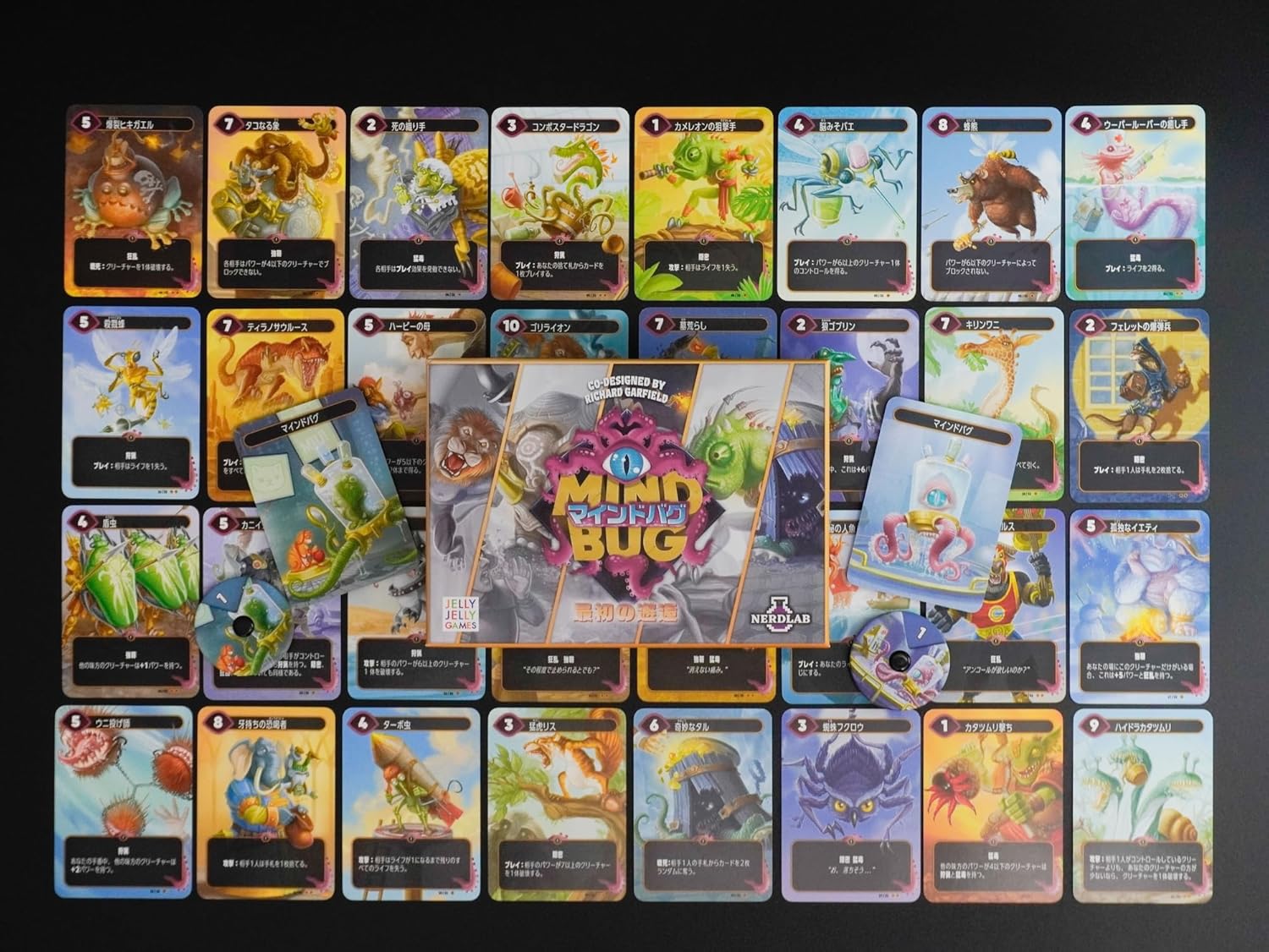 マインドバグは、戦略的思考と心理戦が融合した革新的なカードゲームです。マジック:ザ・ギャザリングの生みの親として知られるリチャード・ガーフィールド氏が共同デザインしたこの作品は、2人から4人で楽しめる本格的な対戦型カードゲームとなっています。 プレイヤーは様々な能力を持つクリーチャーカードを駆使して戦いますが、このゲームの最大の特徴は「マインドバグ」システムです。 相手がプレイしたクリーチャーを奪取できるこの独自のメカニクスにより、常に緊張感のある駆け引きが生まれます。 美しいイラストが描かれたカードには、ライオンや恐竜、エレファント、様々な幻想的なクリーチャーが登場し、ゲームを視覚的にも楽しませてくれます。 買い切り型なので追加購入の必要がなく、箱を開ければすぐに本格的な戦略バトルを始められます。Jelly Jelly Gamesとnerdlabによる日本語版で、ルールも分かりやすく、戦略ゲーム好きにおすすめの一作です。 ・プレイ時間:15〜25分 ・プレイ人数:2人 or 4人 ・年齢対象:8歳以上