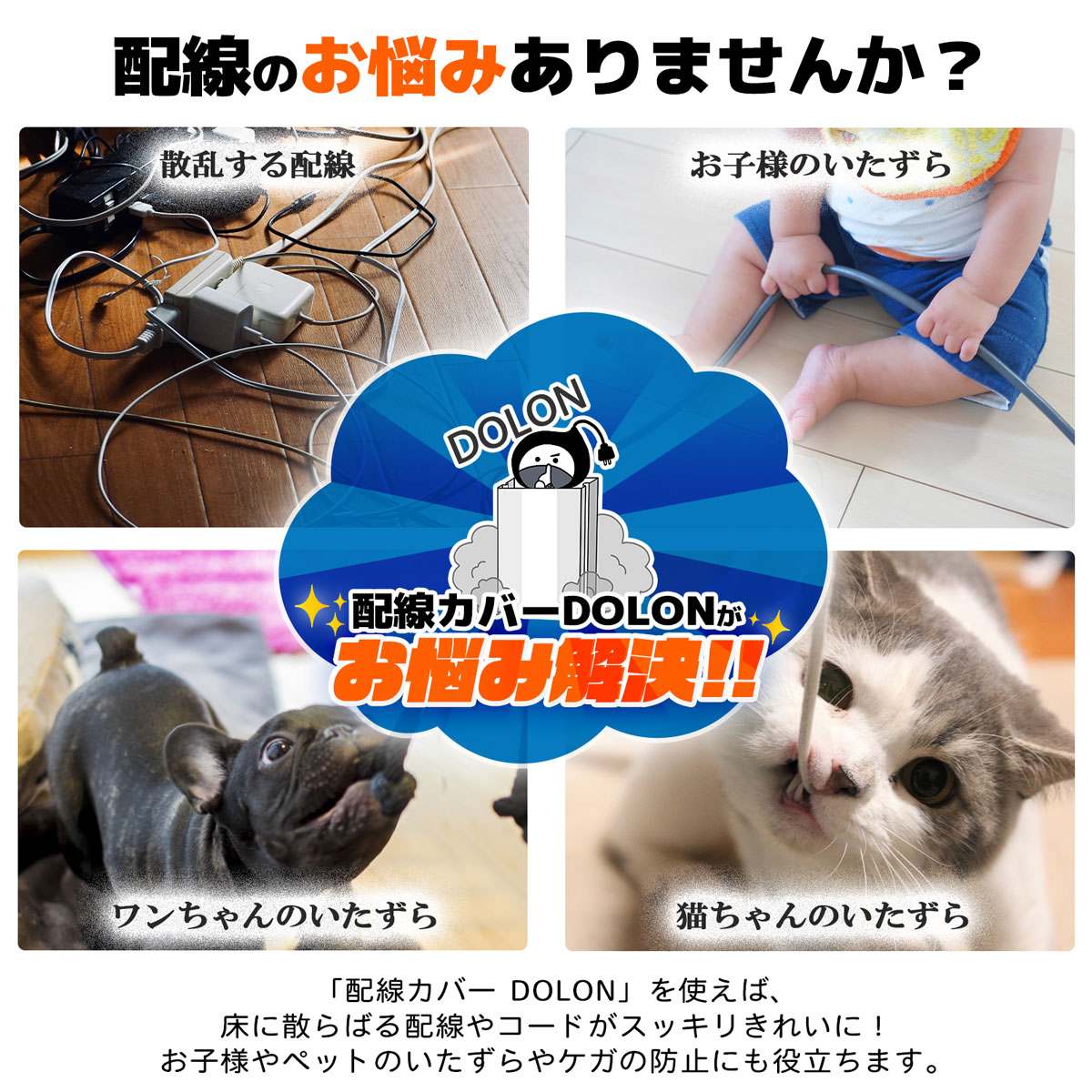 配線カバー DOLON! 商品内容 ●配線カバー本体(両面テープ添付済み) 15本 ●付属品 ・ストレート 12個 ・T型 2個 ・フラットエルボー 8個 ・インナーエルボー 4個 ・アウターエルボー 4個 ・マスキングテープ 1個 規格 配線カバー本体:外径400mm ×25mm ×13mm ●配線カバー本体:PVC 100% ●両面テープ:紙+アクリル系粘着剤 ●マスキングテープ:紙 商品特徴 配線のことでお悩みの方にオススメ!! ・小さいお子様やペットのいたずら対策をしたい ・簡単に取り付けがしたい ・配線周りのお掃除を楽にしたい ・断線トラブルや電力漏れの危険性を防止したい ・配線を隠し、お部屋をスッキリさせたい …etc 【ポイント1:一括収納でスッキリ!】 豊富な収納スペースで、複数の配線もまとめて収納可能 配線周りを一気にスッキリ整えられます。 【ポイント2:着脱が簡単で配線追加がラクラク!】 カバー(フタ部分)は、工具なしで簡単に取り外し可能 設置後でもコードの追加や入れ替えが手軽に行えます。 【ポイント3:壁や壁紙を保護するマスキングテープ付き!】 配線カバー本体の裏面には強力な両面テープでしっかり固定できます 付属のマスキングテープを使えば、壁や壁紙を傷つけずに張り替えが可能なので賃貸でも安心にご使用できます。 ※壁や壁紙の種類・素材によってはマスキングテープがうまく張り付かないことや ?がす際に壁紙を傷つける恐れがあります。 【ポイント4:設置場所によってカスタマイズが可能!】 配線カバーは、お好みの長さに合わせてカットができるので、設置場所を選びません 付属のパーツを使えば、壁にフィットし無駄なく綺麗に仕上がります。 注意事項 ・製造工程や輸送の過程で、一部のパーツに黒い線やわずかなキズが見られる場合があります。 こちらは製品の特性によるもですので、ご利用にあたって機能面や安全面には問題ございません。 また、これらを理由とした返品はお受けいたしかねます。 あらかじめご了承いただきご購入をお願いいたします。 ・製品の製造過程で静電気により少量の粉末が付着することがありますが、これは正常な現象です。気になる方はご注意ください。 ・配送中に外箱に傷や凹みが生じる場合がございますが、中身の商品には問題ございません。これらは正常な範囲内の状態とご理解いただけますと幸いです。 ・貼り付けいただけない場所もございます。詳しくは写真をご参考の上、お買い求めください。 キーワード:配線カバー お得 大容量 インナーエルボー アウターエルボー フラットエルボ 3wayジョイント 検品販売 テレビケーブル パソコンケーブル 家電ケーブル コンセントのケーブル 有線ケーブル お子様 ペット いたずら防止 部屋で配線整理 コード隠し 安全・高品質 ケーブルプロテクター 蓋 かぶせ 被せ