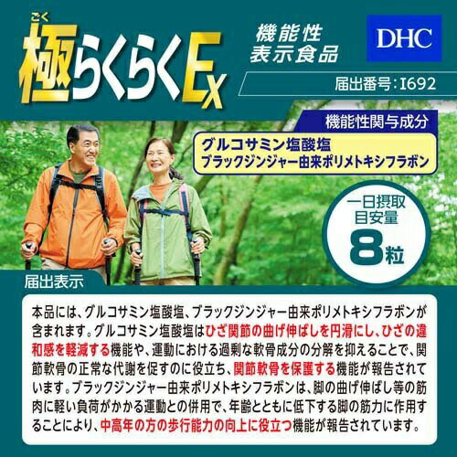 DHC 極らくらくEX 20日分 商品説明 『DHC 極らくらくEX 20日分』 配合された機能性関与成分により、ひざ関節の曲げ伸ばしを円滑にし、ひざの違和感を軽減する機能や、運動における過剰な軟骨成分の分解を抑えることで、関節軟骨を保護する機能が報告されています。 また、筋肉に軽い負荷がかかる運動との併用で、年齢とともに低下する脚の筋力に作用することにより、中高年の方の歩行能力の向上に役立つ機能が報告されています。 機能食品表示届出番号:I692 本品には、グルコサミン塩酸塩、ブラックジンジャー由来ポリメトキシフラボンが含まれます。 グルコサミン塩酸塩は、ひざ関節の曲げ伸ばしを円滑にし、ひざの違和感を軽減する機能や、運動における過剰な軟骨成分の分解を抑えることで、関節軟骨の正常な代謝を促すのに役立ち、関節軟骨を保護する機能が報告されています。 ブラックジンジャー由来ポリメトキシフラボンは、脚の曲げ伸ばし等の筋肉に軽い負荷がかかる運動との併用で、年齢とともに低下する脚の筋力に作用することにより、中高年の歩行能力の向上に役立つ機能が報告されています。 ※本品は、事業者の責任において特定の保健の目的が期待できる旨を表示するものとして、消費者庁長官に届出されたものです。 ただし、特定保健用食品と異なり、消費者庁長官による個別審査を受けたものではありません。 【DHC 極らくらくEX 20日分 詳細】 栄養成分 8粒3216mgあたり 熱量 11.5kcal たんぱく質 0.68g 脂質 0.23g 炭水化物 1.68g 食塩相当量 0.017g グルコサミン塩酸塩 1500mg ブラックジンジャー由来ポリメトキシフラボン 12.0mg メチルスルフォニルメタン 500mg コンドロイチン硫酸 60mg 5-ロキシン(ボスウェリアセラータエキス末) 60mg II型コラーゲン 15mg ヒアルロン酸 10mg CBP(濃縮乳清活性たんぱく) 3mg エラスチンペプチド(魚由来) 2mg 原材料など 商品名 DHC 極らくらくEX 20日分 原材料もしくは全成分 メチルスルフォニルメタン(台湾製造)、乳糖、ブラックジンジャーエキス末、サメ軟骨エキス末(コンドロイチン硫酸含有)、ボスウェリアセラータエキス末、鶏軟骨エキス末(II型コラーゲン、コンドロイチン硫酸含有)(鶏肉を含む)、濃縮乳清活性たんぱく、エラスチンペプチド/グルコサミン(えび・かに由来)、セルロース、グリセリン脂肪酸エステル、シクロデキストリン、微粒二酸化ケイ素、CMC-Ca、ステアリン酸Ca、セラック、ヒアルロン酸 内容量 64.3g(402mg×160粒) 保存方法 直射日光、高温多湿な場所をさけて保存してください。 原産国 日本 販売者 DHC 健康食品相談室 106-8571 東京都港区南麻布2-7-1 0120-575-368 ご使用方法 【1日あたりの摂取目安量】 8粒 一日摂取目安量を守り、水またはぬるま湯で噛まずにそのままお召し上がりください。 ご使用上の注意 原材料をご確認の上、食物アレルギーのある方はお召し上がりにならないでください。ワルファリンを服用の方、また、その他医薬品を服用している場合は医師、薬剤師に相談してください。 ・お子様の手の届かないところで保管してください。 ・開封後はしっかり開封口を閉め、なるべく早くお召し上がりください。 ※本品は天然素材を使用しているため、色調に若干差が生じる場合があります。これは色の調整をしていないためであり、成分含有量や品質に問題はありません。 ・本品は、疾病の診断、治療、予防を目的としたものではありません。 ・疾病に罹患している者、未成年者、妊産婦(妊娠を計画している者を含む。)及び授乳婦を対象に開発された食品ではありません。 ・疾病に罹患している場合は医師に、医薬品を服用している場合は医師、薬剤師に相談してください。 ・体調に異変を感じた際は、速やかに摂取を中止し、医師に相談してください。 ・食生活は、主食、主菜、副菜を基本に、食事のバランスを。 アレルギー物質 乳、えび、かに、鶏肉 広告文責 株式会社プログレシブクルー072-265-0007 区分 機能性表示食品DHC 極らくらくEX 20日分 64.3g(402mg×160粒)×30個セット