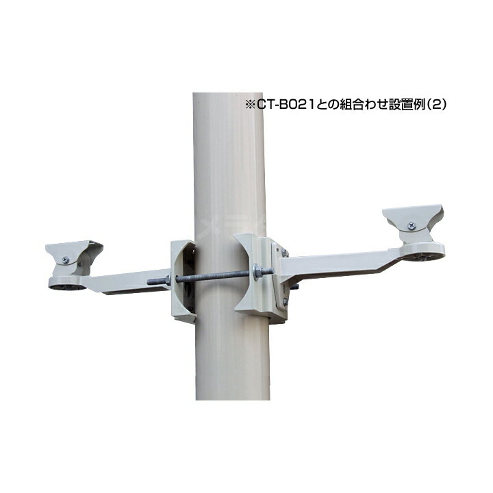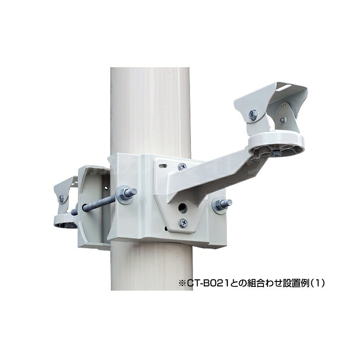 ▼ アイコンの説明はこちら ■ ポール取付ブラケット ポールに防犯カメラやハウジングを取付ける為の取付金具です。 ■ 直径 65〜130mm のポールに適合 本製品は直径が 65〜130mm のポールへ取付可能です。 ■ 別売りのブラケットと組み合わせて設置 防犯・監視カメラやハウジングの取り付けは、別売りのブラケットを使用して設置します。 ポール固定時には、直径10mmの付属ボルトで締め付けます。 ■ 屋外対応のステンレス製 製品本体(アルミ合金)〜固定ボルト類(ステンレス)と全て錆に強い金属で構成されています。 ■ 取り付け可能製品 (別売り) 下記の製品を本製品に直接取り付ける事ができます。 〇ブラケット 【CT-B021】取付ブラケット 【CT-B022】取付ブラケット 〇カメラ 【CT-AHD350】 【CT-AHD440】 【CT-AHD531】 【CT-AHD650】 【CT-AHD670】 【CT-AHD752】 【CT-AHD850】 【CT-AHD860】 【CT-AHD890】 【CT-AHD940】 【CT-AHD950】 【CT-AHD970】 【CT-4KX800】 【CT-4KX805】 【CT-4KX807】