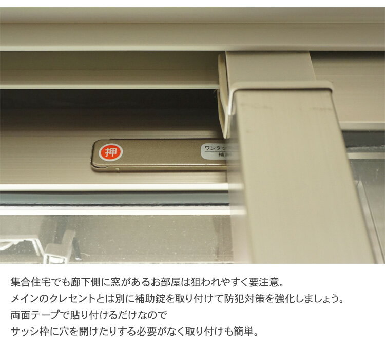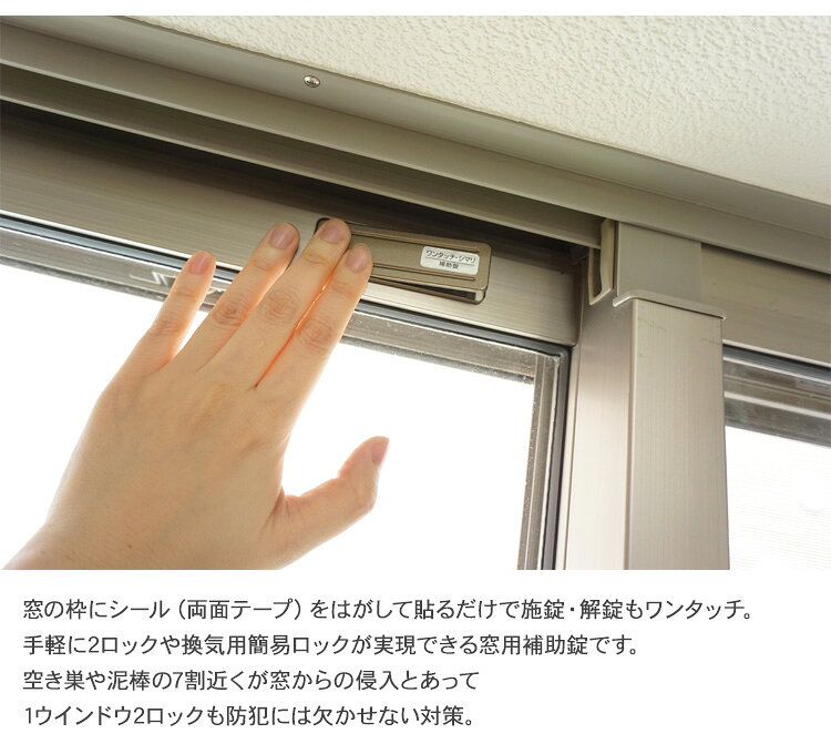 商品説明窓サッシの枠にシール(両面テープ)をはがして貼るだけ。施錠・解錠もワンタッチ! 手軽に2ロックや換気用簡易ロックが実現できる窓用補助錠です。 空き巣などの防犯対策として、今や常識となりつつあるのが、玄関や勝手口の1ドア2ロック。 さらに、戸建住宅では、空き巣や泥棒の7割近くが窓からの侵入とあって、窓の1ウインドウ2ロックも防犯には欠かせない対策です。 マンションなどの集合住宅でも、廊下側に窓があるお部屋は狙われやすく、要注意。 メインのクレセントとは別に補助錠「ワンタッチ・シマリ」を取り付けて、より防犯対策を強化しましょう。 両面テープで貼り付ける「ワンタッチ・シマリ」なら、サッシ枠に穴を開けたりする必要がないので、取り付けも容易です。 ワンタッチで簡単ロック。解除もワンタッチで可能。 ロックしていない状態の「ワンタッチ・シマリ」は厚さ3.5mmなので、取り付けたまま窓の開け閉めもできます。 両面テープは横の動きに強いので、強い力で窓を開けようとしても、容易にずれ落ちる心配はありません。 ※換気用の簡易ロックとして利用する場合は、取り付け位置をずらしてお使いください。カラーシルバー、ブロンズサイズH80×W25×D3.5mm(施錠時奥行:14mm)入り数3個入り材質ステンレスSUS304(焼付塗装)生産国中国取付可能な窓■引き違いの窓またはサッシであること ■内側と外側の窓枠のすき間が4〜10mmであること ■貼り付け面が平らであること注意事項※サッシ枠によっては取り付けできない場合があります。 ※窓の上下に取り付けますと、防犯効果が一層増します。 ※換気用としてご使用の場合は、8cm以内の間隔でご使用ください。 ※換気後、戸を閉める時は、ワンタッチも閉じた状態に戻しておいてください。 ※取り付け後、粘着テープがサッシ枠に完全に接着されるまで、一日ほど放置してからご使用ください。 ※本製品は防犯向上を意図した製品ですが、犯罪を完全に防止するものではありません。防犯 安全 対策 窓 補助錠 泥棒 空き巣 対策 防犯用品 簡単 設置 後付け ベランダ ストッパー 窓用 和気産業関連商品 ガラス破り防止3点セット 460mm×900mm ガラス破り防止3点セット 920mm×1850mm サッシ引き戸用補助錠 ワンタッチ シマリ 小(3個入り) サッシ引き戸用補助錠 ワンタッチ シマリ 大 サッシ窓用補助錠 換気ができる窓ロック CP認定品 防犯フィルム 297x420mm 2枚入 CP認定品 防犯フィルム 590x420mm 2枚入 ガラス破り防止 凹凸ガラス用防犯フィルム 300x420mm 2枚入