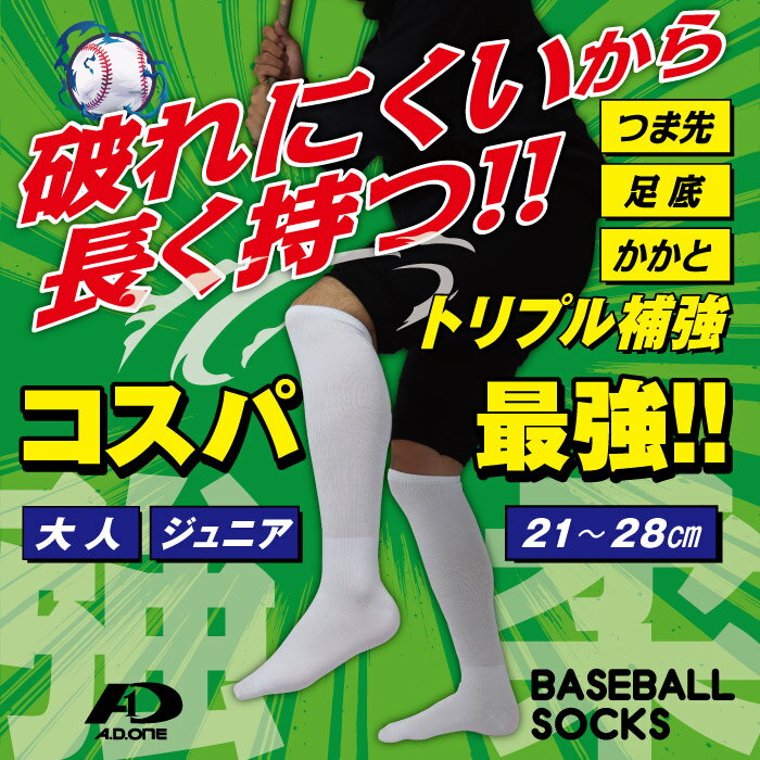【メール便のご案内】 配達完了後の商品紛失につきましては当店では責任を負いかねます。 予めご了承くださいませ。 A.D.ONE オリジナル 野球 ソックス お得な 3足組 補強糸使用 大人 ジュニア 子供 ベースボールアンダーストッキング ホワイト ネイビー ブラック ひざ下 ひざ上 丈が選べる 豊富な 3サイズ グローブやバットのようにプレー中の動きや感覚を足元から支える! アスリート設計の野球専用アンダーソックスです。 季節や用途で選べる! 【ひざ下】【ひざ上】2タイプの丈を用意しました。 【ひざ下丈タイプ】は、その履きやすさから試合だけでなく、 ウォームアップや練習等のトレーニングなど幅広いシーンでスポーツソックスとしても、お使いいただけます。 【ひざ上丈タイプ】は、ショートパンツにも対応のひざ上ジャスト丈設計。 締め付けすぎず、動きに合わせて伸び、ソフトな履き心地を実現! 破れやすいつま先、足底、かかと部に高強度の補強糸を使用したトリプル補強! 無地でシンプルなデザイン。お得な3足組です。ジュニアから大人まで豊富な3サイズを用意いたしました。 チーム、クラブや部活などお揃いで、ご使用いただけます。 破れにくいから長く持つ!!コスパ最強!? 強い・伸びる・柔らかいを備えた攻守兼備! な野球ソックスです。 ※生産時期やモデルによって補強箇所が異なる場合がございます。ご了承ください。 【機能・特長】 ・ずれ落ちにくい口ゴム仕様。 ・吸汗速乾のクールドライ加工。プレー中の足元をより快適に。 ・締め付けすぎない、ミディアムコンプレッション。プレー中にずれ落ちにくく、動きに合わせて伸び、ソフトな履き心地。 ・かかとの収まりがよく、シューズ内のフィット感を向上。破れに強い補強糸を使用。 ・足底に伸縮性を持たせ土踏まずをサポート。特にスレやすい足底部分にも強い補強糸を使用。 ・つま先は圧迫感を減らし、指先を自由に動かせることで、プレー中のバランスや力の伝達をしやすくする設計。破れに強い補強糸を使用。 【素材】 ポリエステル・綿・ポリウレタン 【タイプ & カラー】 ●ひざ下丈タイプ:【01】ホワイト(白)・【02】ネイビー(紺)・【03】ホワイト×ブラック(白黒)・【04】ブラック(黒) ●ひざ上丈タイプ:【01】ホワイト(白)・【02】ネイビー(紺)・【03】ホワイト×ブラック(白黒)・【04】ブラック(黒) 【サイズ】 ジュニアから大人まで豊富な3サイズを用意。 21-24cm 24-26cm 26-28cm 中国製 【ブランド】 A.D.ONE/エーディーワン 1992年 adidas社創設者アドルフ・ダスラーの孫アディー・ダスラーJr.によって設立されたUSAカリフォルニア生まれのスポーツシューズブランド ※使い始めのうちは色落ちする場合がございます。ご使用前に一度洗濯ください。 ※洗濯時のご注意 ●漂白剤は使用しないでください。●口ゴム部を上にして、陰干ししてください。●濃色物と淡色物を一緒に洗わないでください。●淡色物には蛍光増の入っていない洗剤を使用してください。 【検索ワード】ギフト プレゼント バレンタインBRAND NAVI / ブランドナビ紳士 紳士 男性用 MENS 靴下 3足セット 野球 練習 ベースボール トレーニング ソックス アンダー レッグ 抗菌 汚れ 入学式 春休み 旅行 花見 ホワイトデー 贈り物 スーパー 母の日 誕生日 記念日 新生活 新入学 新学期 社会人 初任給 アディダス 人気モデルで選ぶアディダススタンスミスアディダススーパースターアディダスリュックサックアディダスバケットハットニューバランス 人気モデルで選ぶニューバランスCM996ニューバランスWL574ニューバランスBB550ニューバランスML373ノースフェイス 人気アイテムで選ぶノースフェイストートバッグノースフェイスショルダーバッグノースフェイスウインドジャケットノースフェイスウインドパンツ【検索ワード】野球 ベースボール ソフトボール ソックス アンダー ストッキング A.D.ONE エーディーワン ブランド メーカー 吸汗速乾 耐久性 フィット ソフト ズレ落ち防止 ひざ下丈 ひざ上丈 ロング ショート ミディアム 3足組 セット お得 コスパ最強 スポーツ 靴下 無地 シンプル ホワイト ネイビー ブラック 豊富 サイズ 21-24cm 24-26cm 26-28cm メンズ レディース ジュニア キッズ 女子 男子 子供 ユニセックス トレーニング 練習 ウォームアップ 試合 フィールド 球場 球児 少年野球 ボーイズ ガールズ 草野球 リーグ 勝利 アスリート 道具 用品 専用 ユニフォーム チーム お揃い グローブ バット アイテム 小学生 中学生 高校生 クラブ 部活 趣味 実業団 投手 打者 遊撃手 盗塁 ホームラン ピッチャー バッター ランナー 二刀流 5050 優勝 オールシーズン 春 夏 秋 冬 プレゼント お祝い 贈り物 ブランドナビ BRAND-NAVI