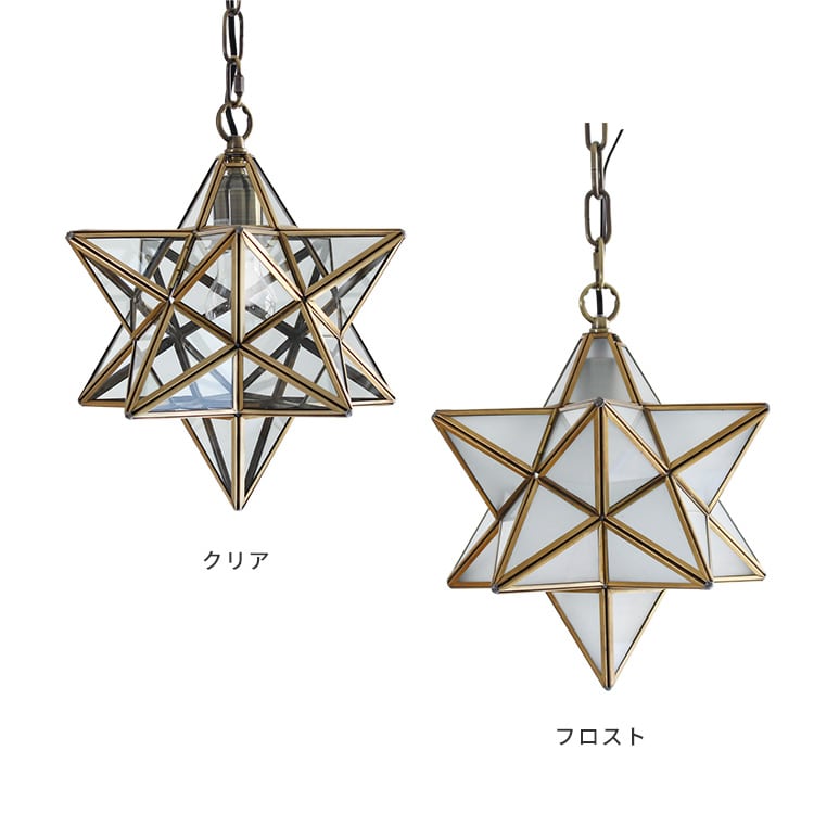 DETAILS Etoile(エトワール)とはフランス語で「星」を表します。その名の通り星をモチーフにしたペンダントライト。天井から吊るすと、まるで夜空に光る星のようですね。 見た目もインパクトありますがクリアタイプは点灯すると壁、天井に印象的な「影」を表現し、空間を幻想的に照らします。 ガラスは、職人が一つ一つ手作業ではめこんでいるこだわりの照明です。金属の本来の風合いを生かしたデザインですので、色・仕上がりには若干の個体差がございます。時間の経過と共に、金属の色・風合いが少しずつ変化する様子を楽しむこともできます。 天井との距離が近いシーリングタイプはこちら 幻想的に広がる星のシルエット 「Etoile(エトワール)」とはフランス語で「星」を表します。その名の通り星を モチーフにしたペンダントライトです。天井から吊るすと、まるで夜空に光る 星のようですね。 ガラスは、職人が一つ一つ手作業ではめこんでいるこだわりの照明です。 金属の本来の風合いを生かしたデザインですので、色・仕上がりには若干の個体差がございます。 時間の経過と共に、金属の色・風合いが少しずつ変化する様子をお楽しみください。 ●POINT1 ダイニングにおすすめ 「Etoile(エトワール)」は、ダイニングテーブルの上に多灯吊りするのが おすすめです。デザイン性が高いので、飾るだけでおしゃれなカフェのような 空間になりますよ。 ●POINT2 トイレや玄関などの小空間にも エトワールに付属されている電球は40Wと落ち着いた明るさなので、1灯でご使用いただく場合は、 トイレや玄関などの小空間にぴったりです。 存在感のあるデザインなので、空間のアクセントになりますよ。 ●POINT3 クリア電球で浮かぶ陰影 点灯すると壁や天井に印象的な「影」を表現し、空間を幻想的に照らします。 (光源と天井・壁の距離により影の出方が異なります。またフロストカバーの電球では影が出ません。) ●POINT4 高さ調整も簡単 「エトワール」はフランジカバーの中にコード調節器具がついているので、 簡単にコードの長さ調節ができます。また余ったコードはフランジカバーの 中に収納することができます。 ●POINT5 シェードによって変わる雰囲気 エトワールはシェードによって、お部屋の雰囲気が変わります。 クリアタイプは天井や壁に影が映り、幻想的な雰囲気にしてくれます。 影が映るのが苦手な方は、影が映りにくいフロストタイプやフロストカバー電球をご使用下さい。 ※写真はクリアカバー電球を使用しています。 商品サイズ シェード:直径270×高さ340(mm) 全高:580~1500(mm) フランジカバー:直径140(mm) 重量 約2.1(kg) 素材 ガラス、真鍮 カラー クリア:LP3020CL/4571163647372 フロスト:LP3020FR/4571163647365 仕様 口金/E26 40W×1まで対応(白熱球付属) ※LED電球、電球型蛍光灯対応 引っ掛けシーリングチェーン吊り 変更情報 2016年11月4日:余分なチェーンを取り外せ、すっきり簡単に高さ調整することが可能になりました。 全高1000mm→1500mmへ変更、重量1.8kg→2.1kgへ変更。 注意事項 本商品は正規品です。 お買い物の際は、会社概要の「その他の注意点」を必ずご確認ください。玄関やトイレにおすすめ「シーリングライト」が登場! チェーンを無くしたシーリングタイプが登場しました。トイレや玄関など狭い空間に最適なコンパクトサイズです。エトワールのシーリングタイプは当社オリジナルです。気になった方は是非チェックしてみてください。