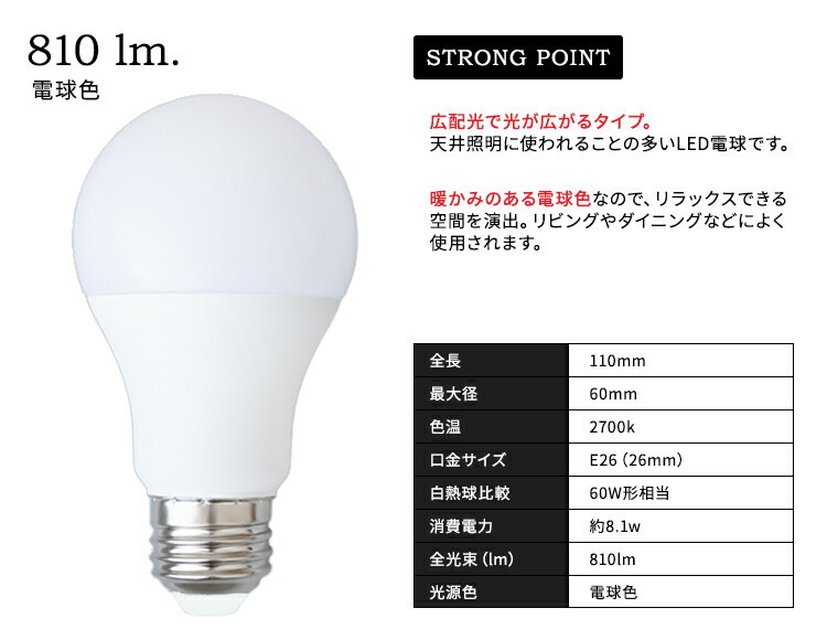 LED電球 810lm E26 4個セット【 電球色 810lm led電球 led 一般電球 口金 電球 60W相当 26mm 照明器具 おしゃれ インテリア トイレ 内玄関 廊下 便利 e26 新生活 テレワーク 在宅】