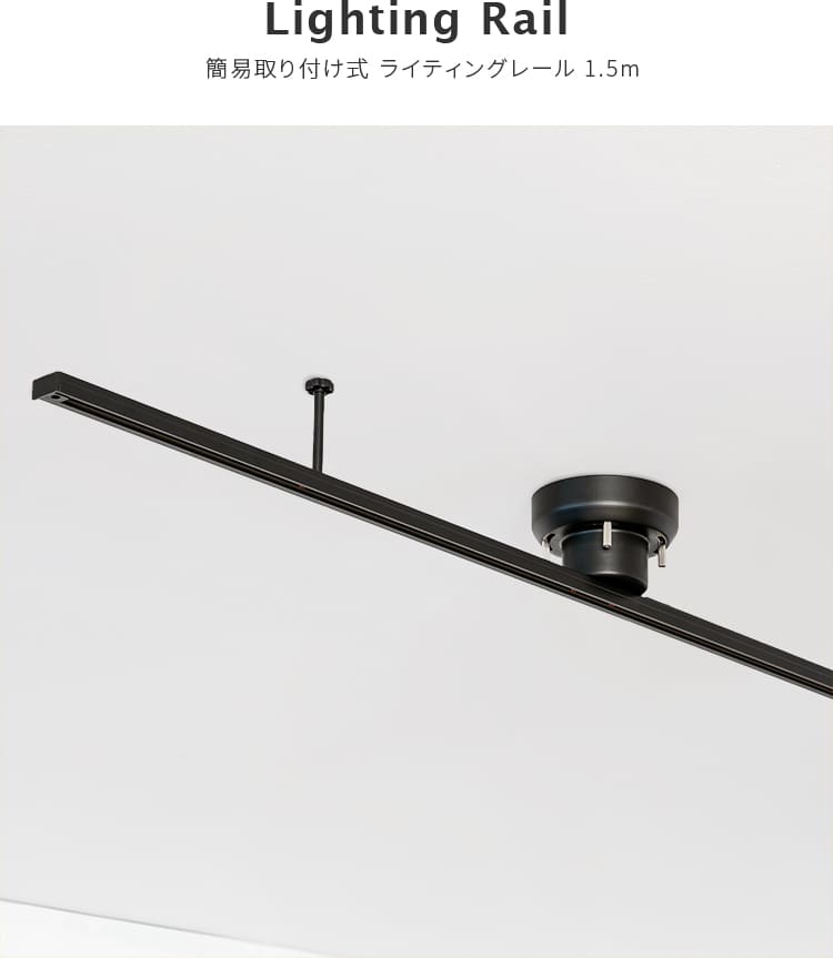 DETAILS 天井備え付けの引掛シーリングに、簡単に取付けられるライテイングレール。 ライティングレール1mと比べ、より幅広く照明を設置できる1.5mが登場しました。 スポットライトやペンダントライトを複数取り付けることができます。 照明の取り付け方も幅広くなったライティングレール1.5mでカフェのような空間づくりをしませんか? POINT1 工事不要の簡単取り付け 簡易取り付けタイプのライティングレールは、天井に穴を開けずに設置ができるため、賃貸のお住まいでも安心してお使いいただけます。 電気工事不要なので、工事費がかからず経済的です。 POINT2 しっかり明るさを確保できる レールタイプの電源なら明るさが足りない場合は付け足すことができ、気分によって照明を簡単に変えることができます。 明るさも確保しながらご家庭でいろいろなライティングを楽しむことができますよ。 設置する照明は総重量5kg以内であれば取り付け可能です。 POINT3 照らしたい位置を簡単に調節 ライティングレールなら取り付け位置を細かく調節できます。 ダイニングテーブルと天井電源の位置がずれている場合、ライティングレールを使うことで照らしたい位置に照明を合わせることが可能です。 (天井電源から調節可能幅:最大約70cm) POINT4 好みの照明で個性的に ホームセンターなどで売られているレール(配線ダクト)用フックを使用すると、ハンギングポットや植物を飾ることもできます。 お気に入りのインテリアや照明を組み合わせて、個性のある空間づくりをしてみませんか? 商品サイズ 本体サイズ / 幅1500×奥行き155×高さ120(mm) フランジカバーサイズ / 直径150×高さ100(mm) 材質 スチール 重量 約1.45(kg) カラー ブラック / ホワイト 仕様 耐荷重 / 5kgまで(片側のみの場合、2.5kgまで) 電気容量 / 6A(100V電源で600Wまで) 注意事項 お買い物の際は、会社概要の「その他の注意点」を必ずご確認ください。