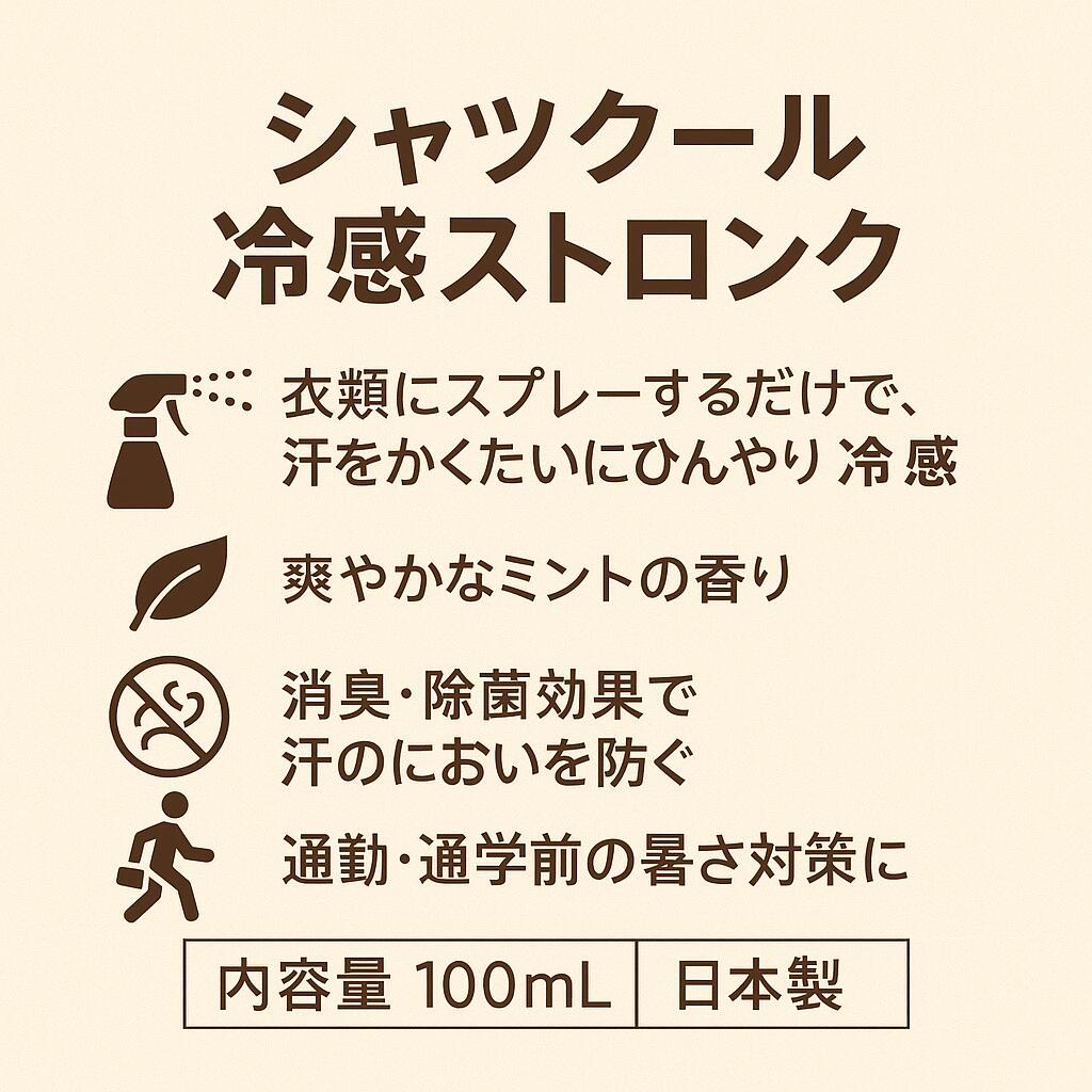 ●衣類にスプレーするだけ●冷感成分が汗をかくとひんやり気持ち良い冷感を与えます。●衣類についた菌を除菌します。●爽やかな香り付き詰替え用。衣類にシュッとスプレーするだけで、冷感成分が汗をかくたびにひんやり気持ちいい冷感を与えます。内容量100ml主成分エタノール、l-メントール使用方法(1)中央のストッパーをOPENのところまでまわす。(2) 衣類から10cm以上離して、衣類全体にスプレーする。(1ヶ所当たり3~5スプレーが目安です)ワキや背中、首元など汗をかきやすい部分の衣類にスプレーすると効果的。衣類を着たままでも使用できる。(3)使用後は中央のストッパーをOPENのところから元の位置まで戻す。※冷感の回数・強さ・持続を不十分に感じた時は再度スプレーしてください。・同じ部位に大量に噴霧しない。・冷感や刺激の感じ方には個人差がある。・衣類を着たままスプレーする際は、肌に直接かからないように注意する。・アルコール過敏症の方、特に肌の弱い方、乳幼児は使用を避ける。・ゆっくりスプレーすると霧状にならない場合がある。注意・小児、認知症の方などの手の届くところに置かない。・小児、認知症の方などの誤飲に注意する。・用途外には使用しない。・火気の近くで使用しない。(火気は衣類が完全に乾いてから使用する。)・火気を使用している室内で大量に使用しない。・車内、その他密閉空間では使用しない。・本品は衣類専用なので、肌に直接使用しない。・衣類が汚れていたり、シミがついていると輪ジミになる可能性があるので、付着物を除去してから使用する。・革、毛皮、人工皮革、和装品は避ける。・絹・レーヨンなど水に弱い繊維や、色落ち・色移りの心配があるものは、あらかじめ目立たない部分で確認する。また、噴霧した衣類の上に、色落ち・色移りしやすい衣類を重ね着しない。・肌の弱い方はあらかじめ少量で試し、肌に異常がないことを確認し使用する。・皮ふに異常(傷口、やけど、日焼けによる熱傷など)がある部位にあたる箇所には使用しない。・直接肌に触れる場所にスプレーする際は、回数を減らすなど調整する。・肌に合わない場合は使用を中止する。・皮ふのうすい部分や粘膜に触れる衣類には使用しない。・変色する場合があるため、床、テーブル、樹脂製品についた場合はすぐに拭き取る。・逆さまでは使用しない。・車内や高温の場所、直射日光の当たる場所を避け、涼しい場所に保管する。※火気厳禁※誤飲に注意販売元小林製薬株式会社広告文責yuriya 03-6824-6272シャツクール詰め替え用 冷感ストロング 370ml 2個セット1,800円アイスノン シャツミスト 詰め替え 280ml 4個 エキストラミントの香り 2,780円アイスノン シャツミスト ICE KING つめかえ用 280ml 4個3,180円ひんやりシャツシャワーストロング 詰め替え 400ml グレープフルーツの香り 3,380円ひんやりシャツシャワー ストロング ミントの香り 400ml 2個 詰め替え用 2,180円ひんやりシャツシャワー ストロング ミントの香り 400ml 3個 3,280円ひんやりシャツシャワーストロング 詰め替え 400ml 12個 グレープフルーツの香り 11,280円ひんやりシャツシャワー ミント&グレープフルーツの香り 詰め替え 400ml 1,980円様々な用途でご利用されています。季節のギフト御正月 お正月 新年 新春 初荷 御年賀 お年賀 御年始 節分 ひな祭り お花見 花見母の日母の日ギフト 母の日プレゼント父の日 父の日ギフト 父の日プレゼント初盆 お盆 御中元お中元 お彼岸 残暑御見舞 残暑見舞い 敬老の日 寒中お見舞ハロウィン クリスマス クリスマスプレゼント 年末 御歳暮 春夏秋冬 帰省土産春グルメ 夏グルメ 秋グルメ 冬グルメ お歳暮 年越し日常の贈り物御見舞 退院祝い 全快祝い 快気祝い 快気 内祝い 御挨拶ごあいさつ 引越しご挨拶 引っ越し お宮参り御祝 志 進物お土産 ゴールデンウィーク GW BBQ バーベキュー 帰省土産バレンタインデー バレンタインデイ ホワイトデー ホワイトデイお花見 ひな祭り 端午の節句 こどもの日 ギフト プレゼント御礼 お礼 謝礼 御返し お返し お祝い返し 御見舞御礼 ありがとうお祝い / 祝辞60歳 61歳 還暦 かんれき 還暦御祝い 還暦祝 祝還暦 華甲 かこう70歳 古稀 77歳 喜寿 80歳 傘寿88歳 米寿、90歳 卒寿 99歳 白寿合格祝い 進学内祝い 成人式 御成人御祝 卒業記念品卒業祝い 御卒業御祝 入学祝い 入学内祝い 小学校 中学校 高校 大学 就職祝い社会人 幼稚園 入園内祝い 御入園御祝お祝い 御祝い 内祝い 金婚式御祝 銀婚式御祝 御結婚お祝い ご結婚御祝い御結婚御祝 結婚祝い 結婚内祝い 結婚式引き出物 引出物 引き菓子 御出産御祝 ご出産御祝い 出産御祝 出産祝い 出産内祝い新築祝い 新築御祝 新築内祝い 祝御新築 祝御誕生日誕生日 バースデー バースディ バースディー 七五三御祝 753 初節句御祝 節句昇進祝い 昇格祝い 就任 御供 お供え物 粗供養 御仏前 御佛前 御霊前香典返し 法要 仏事 新盆 新盆見舞い 法事 法事引き出物 法事引出物 年回忌法要一周忌 三回忌 七回忌 十三回忌 十