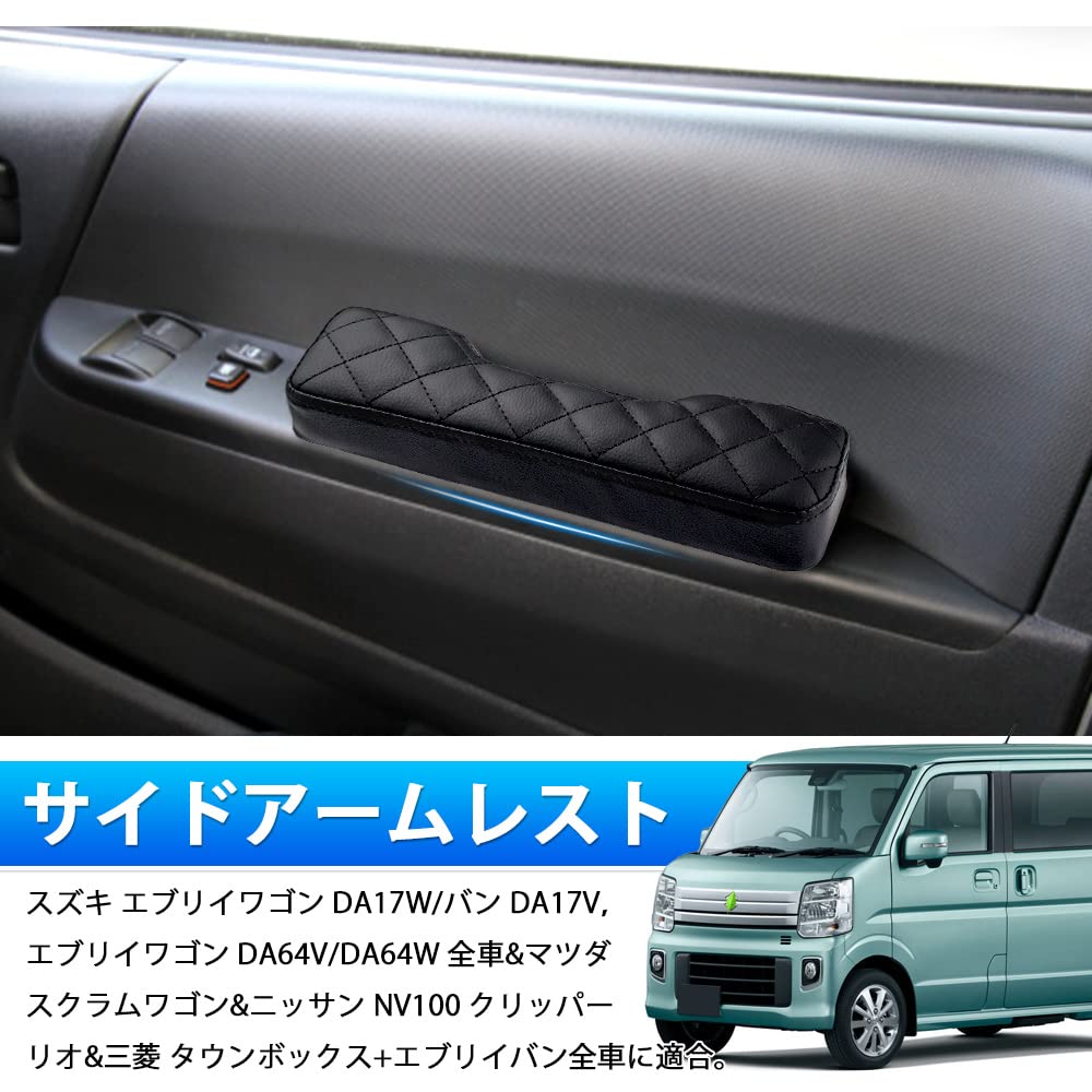 商品情報商品の説明主な仕様 【適合車種】:スズキ エブリイワゴン DA17W/バン DA17V,エブリイワゴン DA64V/DA64W 全車&マツダ スクラムワゴン&ニッサン NV100 クリッパーリオ&三菱 タウンボックス+エブリイバン全車に適合。※年式、グレードなどにより適合しない場合がございます。※※取り付ける際に本体が干渉する場合ございます。ご了承ください。※※※OME車への適合につきましては未確認でございます。※エブリィ ジョイン(JOIN)に装着不可です。br【商品内容と素材】ドアアームレスト本体*2(左右1セット)。付属品:長いネジ4PCSと短いネジ4PCS。高品質PUレザーと柔らかなタイプのスポンジ素材。独特なデザインと素材の合わせで、ユニックな快適感実現!取り扱いも便利に!上と下の面が菱形の縫製で、スタイリッシュを演出します。br?【疲労を軽減、カーライフをサポート】高品質PUレザーの表に柔らかなタイプのスポンジいっぱいに充填され、柔らかさも程よいで高さ・肘の置き心地良く、運転距離と関わらずにドライブをお楽しめます。br【取り付け方法】ドアポケット内のビスをプラスドライバーで外し共締めするだけで簡単に装着可能です。初めての方でも簡単でスムーズに取付いただけます。※左右一セットで右の方に金属部分には「R」というマックがあり。br【2022年最新型車種専用設計】 ピッタリフィットする車種専用、2021最新なオリジナルデザインで、ユニークな体験ができます。 ※ 万が一商品不具合のようでしたら、いつでも気軽にご連絡くだい。ご注文日より1年間の安心保証がございます。