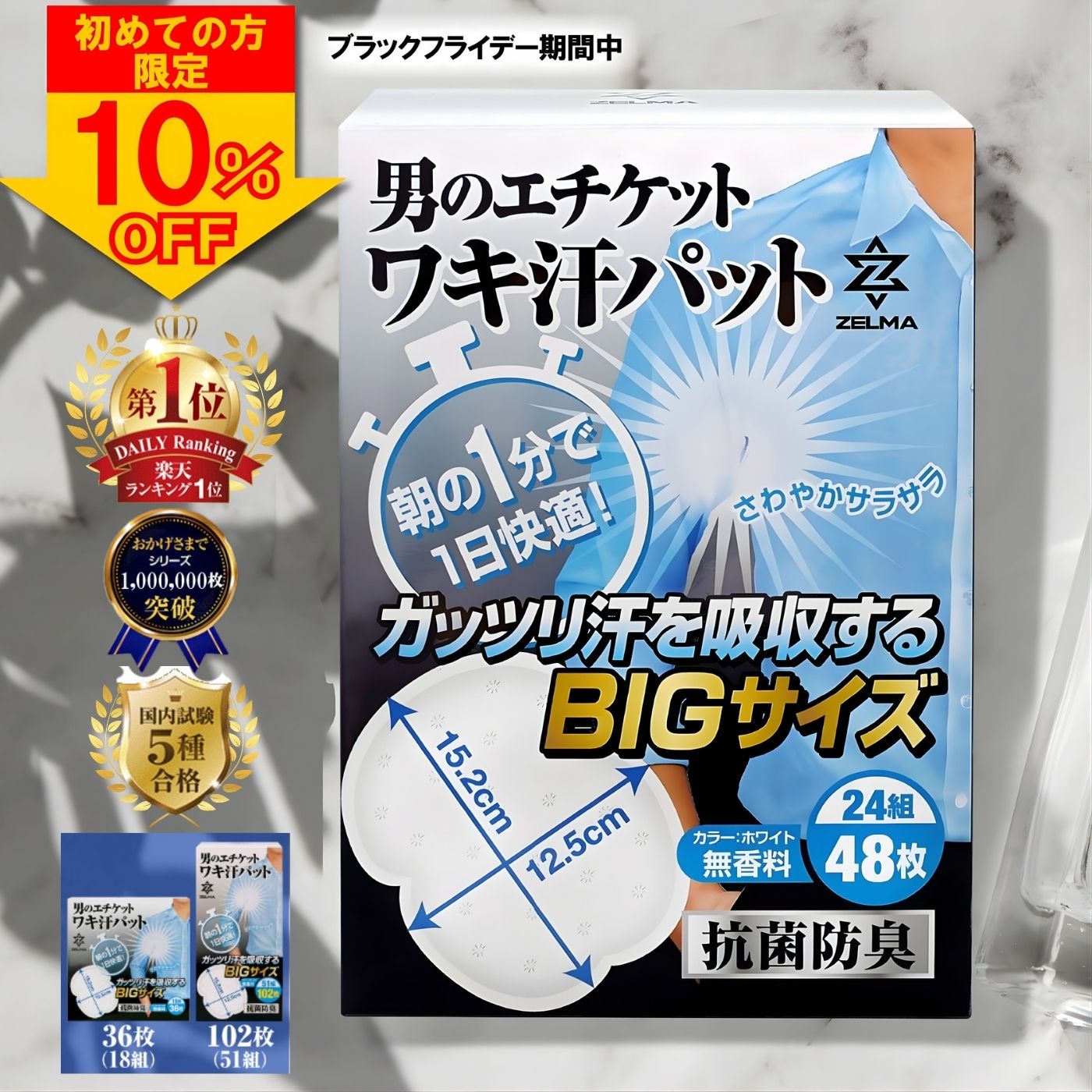 商品説明 2層構造の設計:内側はヤシガラ由来の多孔質活性炭でニオイを吸着、外側は通気性の高い綿素材で汗をすばやく吸収・放湿。 臭気判定士監修の消臭設計:専門家の知見を反映した設計で、快適な使い心地を目指しました。 目立ちにくいベージュカラー:肌なじみがよく、白シャツや薄手の服装でも自然に使えます。 直貼りでズレにくい安心設計:薄型でしっかり密着。動いてもはがれにくい仕様です。 吸収速乾でさらっと快適:汗取りパッドとしてデイリーケアをサポート。 使い捨てタイプで衛生的:いつでも清潔にお使いいただけます。 「直貼りで汗をキャッチし、速乾性で快適さをキープ。汗ジミ対策の新定番アイテムです。」 脇汗ケア&ニオイ対策に。極薄直貼りシート(楽天ランキング入賞) 汗が気になる季節に便利なワキサラ消臭シート。直貼りタイプで目立ちにくく、ドレスやビジネスウェアなど大切な衣類にも合わせやすいのが特長です。 はがれにくい設計で、長時間の外出にも心強いサポート。レビューでもリピート購入の声が多く、手軽に始めたい方にうれしい20枚入りです。 剥がれにくい&目立ちにくい。ベージュで自然になじむ 直貼りタイプだから、動いてもズレにくく安心。極薄&ベージュ設計で服にひびきにくく、装いを選ばず使えます。夏場はもちろん、暖房の効いた冬場の汗ジミ対策にも便利です。 肌にやさしい使い心地で、毎日のエチケットを快適に ワキサラ消臭シートは、脇汗を吸収してニオイケアを意識した設計。直貼りでも肌にやさしい使い心地を目指しました。薄手シートで目立ちにくく、通勤・通学・イベントなど様々なシーンで活躍します。 その他 商品画像はイメージです。※効果効能を保証するものではありません。 商品名 ワキサラ消臭シート(直貼り脇汗パッド) 内容量 20枚入 材質 綿・ポリウレタン・活性炭層 サイズ 約9.5×6cm(最大値) 対応年齢・性別 10代~80代/レディース・メンズ兼用 ご使用方法 皮膚を清潔にし、よく乾かしてからご使用ください。 裏面フィルムをはがし、黒い面を気になる箇所に貼り付けてください。 ※用途以外のご使用はお控えください。 使用上の注意 傷・はれもの・かぶれ等の異常がある部位には使用しないでください。 アレルギー体質の方やテープでかぶれやすい方は使用をお控えください。 短時間で多量の汗をかいた際は、シート内側に汗がたまる場合があります。その際は一度はがし、汗を拭き取って新しいシートに貼り替えてください。 お肌の弱い方は、使用前に二の腕の内側でパッチテストを行い、24時間後の皮膚状態をご確認ください。 赤み・はれ・かゆみ等の異常があらわれた場合は使用を中止し、専門医にご相談ください。 はがす際は肌を押さえながら、ゆっくりとはがしてください。再使用はできません。 制汗剤等を同時に使用すると、貼り付きにくくなる場合があります。 肌質 オイリー肌/乾燥肌/混合肌/敏感肌/普通肌に配慮した設計・無香料 ※デリケートゾーン・傷・腫れの部位には使用しないでください。 製造国 / 用途 日本 / 脇汗ケア・ニオイ対策(直貼りタイプ) 関連アイテム:脇汗パッド・脇汗シール 併用におすすめ:制汗剤・ロールオン極薄 脇汗パッド 直貼り ワキサラ消臭シート 20枚 日本製 汗ジミ対策・速乾吸収 楽天ランキング1位入賞!使い捨てタイプの脇汗パッド 脇汗・ワキガ・ニオイ対策に!直貼りで目立ちにくい安心設計 ドレスやビジネスウェアにもOK!汗ジミ対策で清潔感をキープ 楽天ランキング入賞 ワキサラ 消臭シート 脇汗対策 脇汗パッド デオドラント 制汗剤 人気商品 汗ジミ対策 ニオイ対策 通気性 脇汗パッド 女性用インナー 臭気判定士監修 消臭設計 蒸れ配慮 密着ズレにくい 目立ちにくい 消臭シート 直貼り ズレにくい 吸汗構造 消臭シート 汗対策 2層シート 通気性 吸放湿性 吸汗シート 快適設計 伸縮フィット 消臭シート 全身用 汗対策シート 脇 足裏 胸元 ニオイケア シールタイプ ファッション対応 消臭シート 浴衣 Tシャツ ジャケット ブラウス対応 使用方法 簡単ケア はがしやすい 消臭シート パッチテスト推奨 レビュー高評価 リピート多数 貼りやすい はがしやすい 脇に直接貼る 脇汗パッド ワキサラ消臭シート 日本製 メンズ レディース兼用 汗ジミ対策 使い捨てタイプ 剥がれにくい直貼り設計で、動いても安心。 高吸収で衣類を守り、汗とニオイケアを両立。 極薄&ベージュで服にひびきにくく目立ちにくい。 春夏秋冬の汗対策に活躍。 脇だけでなく足裏・胸元にも使える全身用シート。 おしゃれ着やビジネススーツにも合わせやすい。 使い捨てタイプで衛生的に使用可能。 汗ジミやニオイでお悩みの方におすすめの脇汗パッドです。 汗ジミやニオイでお困りの方には、 脇汗パッド・脇汗シールがおすすめ。 さらにしっかり汗をケアしたい方は、 制汗剤・ロールオンも併用すると効果的です。
