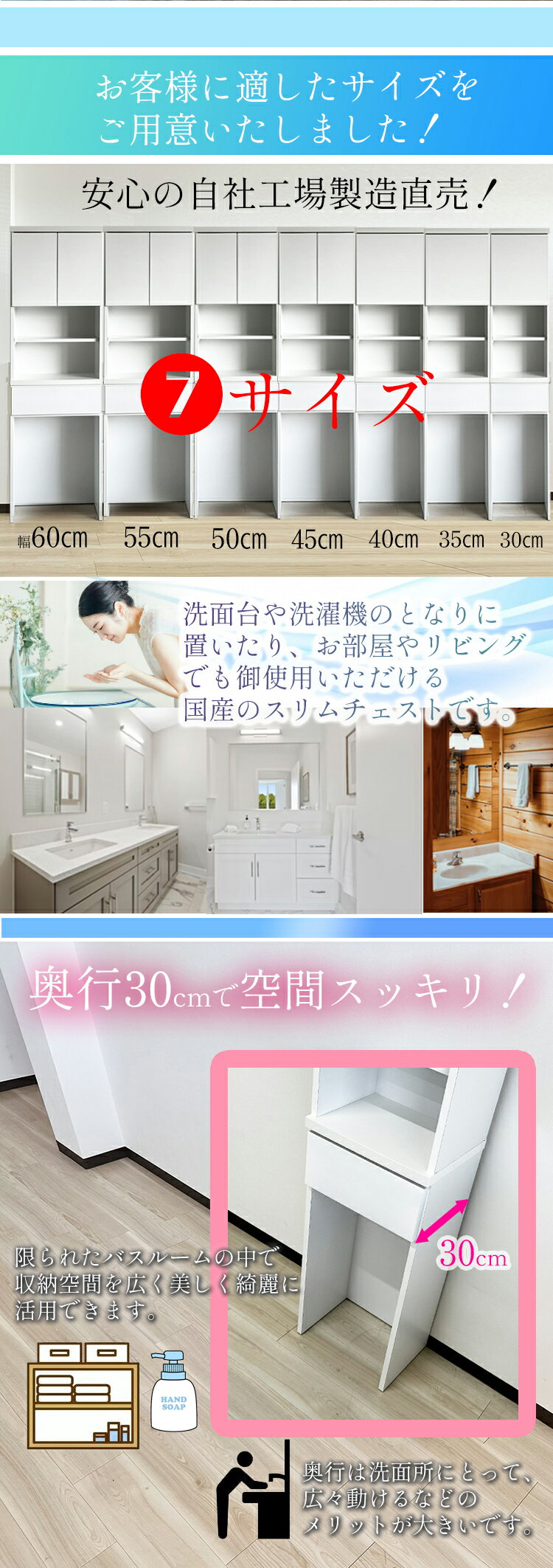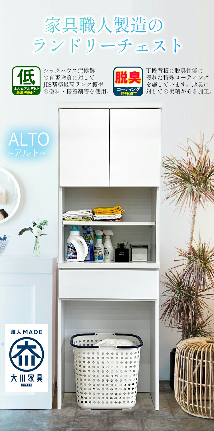 商品名 ランドリーチェスト スリム 薄型 国産 大川家具 (Alto-アルト-) 奥行30 引き出し 消臭 脱臭 サイズ(シリーズ全商品掲載) 幅30cm:約幅29.8×奥行30×高さ181cm 幅35cm:約幅34.8×奥行30×高さ181cm 幅40cm:約幅39.8×奥行30×高さ181cm 幅45cm:約幅44.8×奥行30×高さ181cm 幅50cm:約幅49.8×奥行30×高さ181cm 幅55cm:約幅54.8×奥行30×高さ181cm 幅60cm:約幅59.8×奥行30×高さ181cm 天板厚み:3cm 側板・棚板厚み:2cm 材 質 前板:MDF/ウレタン樹脂(エナメル塗装) 側面:プリント紙化粧繊維板 背面:脱臭シート(下部の背面背板内側) 特徴 福岡県大川市(大川家具)の自社家具製造工場で造られたホワイトを基調としたランドリー収納です。 実用性ある扉付き収納とラックがついた便利な仕様と、消臭性能を加えた新しい機能性を持ったランドリー家具です。 日常生活の臭いについての脱臭に特化した特殊なコーティングを行い、より良い快適空間に調節してくれる性能を加えました。 引き出しもタオルや浴室小物もしっかり収納できるように最適な高さとサイズ造りを考えました。 洗面所の広さも様々ですので、置ける場所に合わせたサイズで、幅30cmから60cmまでのサイズをご用意しています。 下部は洗濯かごを入れる想定でしておりますが、体重計・ヘルスメーターや家電・衣類以外でもリビング収納や玄関収納としてもご使用いただけます。長身な家具のため耐震ベルトもご使用いただければ安心です。 備考 ほぼ完成品(上部と下部を連結します。簡易組み立て品となります。) 【生産】 福岡県大川市/自社製造家具工場/国産/大川家具 お客様楽々検索ワード: 消臭性能 ランドリーチェスト スリム 薄型 スリム 奥行30 幅60 国産 (Altol-アルト-) ランドリー収納 チェスト ランドリー 脱衣所 収納 棚 洗面所 白 ホワイト ラック 引き出し サニタリーチェスト サニタリー収納 隙間 ほぼ完成品 おしゃれ 収納家具 大川家具 ・メーカー希望小売価格はメーカーカタログに基づいて掲載しています消臭性能 ランドリーチェスト スリム 薄型 スリム 奥行30 幅45 国産 (Altol-アルト-) 洗濯機 ラック 木製 洗濯かご 置き おしゃれ 実用性 国産 大川家具 自社製造 ☆Alto~アルト~ランドリーチェストシリーズ!消臭/国産/大川家具 サイズ幅 30cmタイプ 35cmタイプ 40cmタイプ 45cmタイプ 50cmタイプ 55cmタイプ 60cmタイプ
