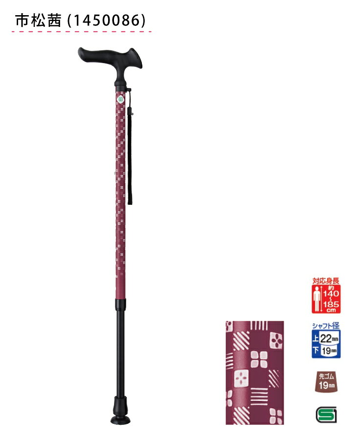 商品サイズ:幅15×奥行4×高さ73cm 280g材質:シャフト=アルミニウム グリップ=ポリプロピレン ストラップ=ナイロン 替えゴム=合成ゴム 原産国:台湾 完成品 対応身長=約140〜185cm使用替えゴム=16mm用DX重量=約280g約73.0〜95.5cm伸縮(10段階調節・2.5cmピッチ)身長に合わせて伸縮させることができるステッキです。グリップはシボ加工によりすこし滑り難くなっています斜めから突いても安定感のあるDX先ゴムを採用先ゴムの角度が接地面に合わせて変わるので、地面を突いた時に安定感があります。高級感のある市松柄=黒・茜の2色。SGマーク取得【代引きについて】こちらの商品は、代引きでの出荷は受け付けておりません。【送料について】北海道、沖縄、離島は送料を頂きます。