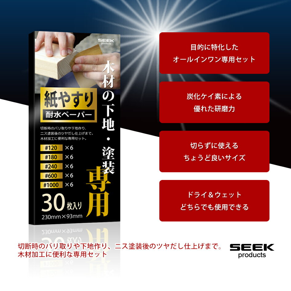 ■SEEK products 木材の下地 塗装専用 耐水ペーパーセット 5種類 30枚 #120-1000 サンドペーパー 紙やすり■ 切断時のバリ取りや下地作り、ニス塗装後のツヤだし仕上げまで。木材加工に便利な専用セット。 ◆目的に特化したオールインワン専用セット◆ ◆炭化ケイ素による優れた研磨力◆ ◆切らずに使えるちょうど良いサイズ◆ ◆ドライ&ウェットどちらでも使用できる◆