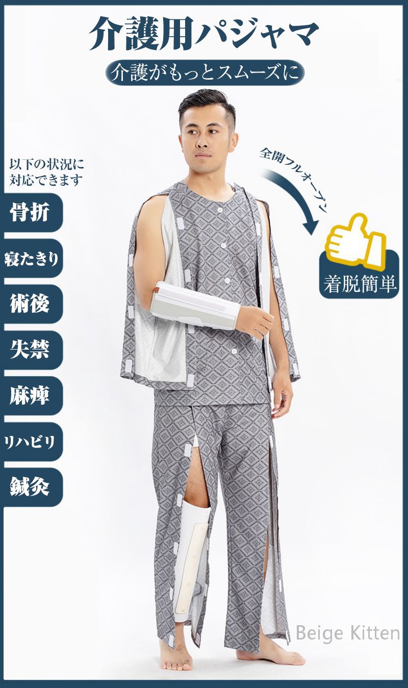 着脱簡単「男女兼用・春秋用」介護用パジャマ 長袖 患者服 病院服 トップス ズボン レディース メンズ 介護パジャマ パジャマ ボトムス マジックテープ介護 全開フルオープン 要介護 術後 入院 点滴中サポート 寝たきり 介護服 M L XL XXL 3XL