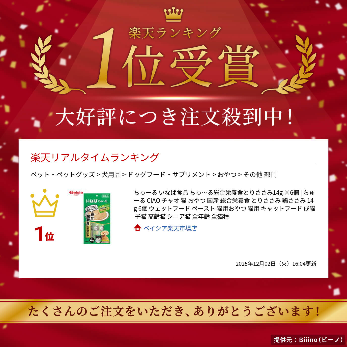 商品情報メーカー名いなばペットフード商品特徴犬用ちゅ〜るに総合栄養食タイプが登場。とりささみをベースに愛犬の好きな素材をトッピング。保存料不使用。内容量14g※予告なくパッケージ、商品名、産地等が変更になる場合がございます。予めご了承ください。