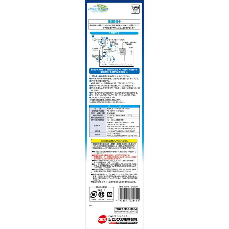 ・冷却ファンによる冷やしすぎ防止・本体を水から守る、防滴設計・誤作動を防ぐ、優れた耐ノイズ性・各社対応1Wからのファンに対応、100Wまでの冷却ファン用・制御温度範囲15〜35℃ 商品仕様・説明 メーカー名 ジェックス 原材料 ケースU:ABS、ケースL:ABS、ダイアル:ABS、LEDホルダー:PS 使用方法 ※使用するファンの設置方法に従って取り付けてください。サーモスタット本体を水槽より高い位置の壁などに吊り下げ、水槽に固定したファンを差し込みプラグをサーモスタットのファン用コンセントに差し込みます。サーモスタットの水温調節ダイヤルを希望の水温に合わせ、サーモスタットの差し込みプラグをコンセントに差し込みます。 使用上の注意 ・本製品には必ず観賞魚用ファン(別売)が必要です。本製品だけでの使用はできません。・本製品は、100Wまでの冷却ファンにご使用ください。・水を撹拌するために、エアレーション用エアーポンプ、またはろ過装置をご使用ください。・本製品は直射日光のあたる場所や、湿気、ほこりなどの多い場所、油煙や湯気が当たる場所では使用しないでください。 原産国名 インドネシア 内容量 1個 【ご注意(免責事項)> 必ずお読み下さい】商品情報には注意を払っておりますが、メーカー都合により予告なくパッケージ、商品名、容量、産地等が変更になる場合がございます。予めご了承ください。