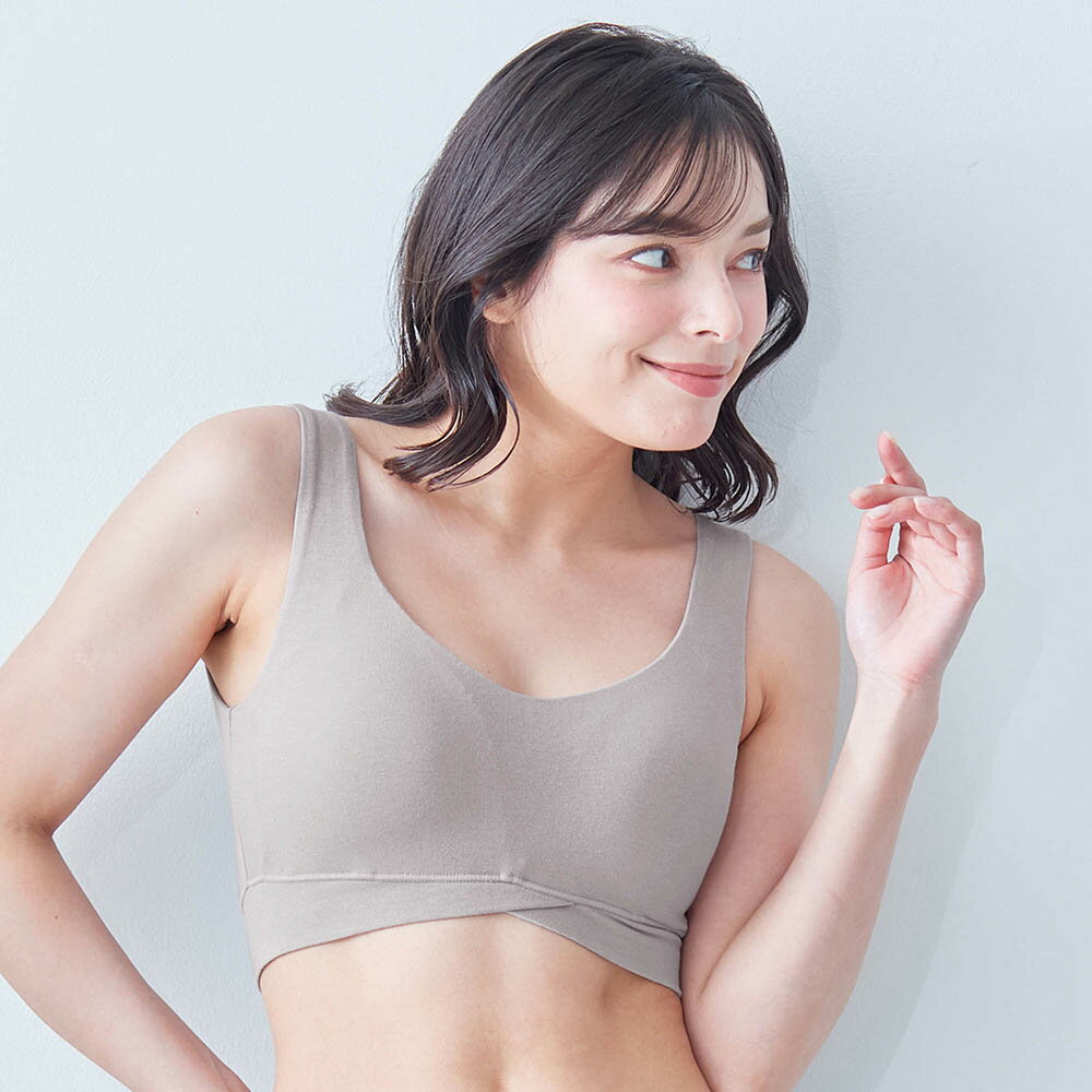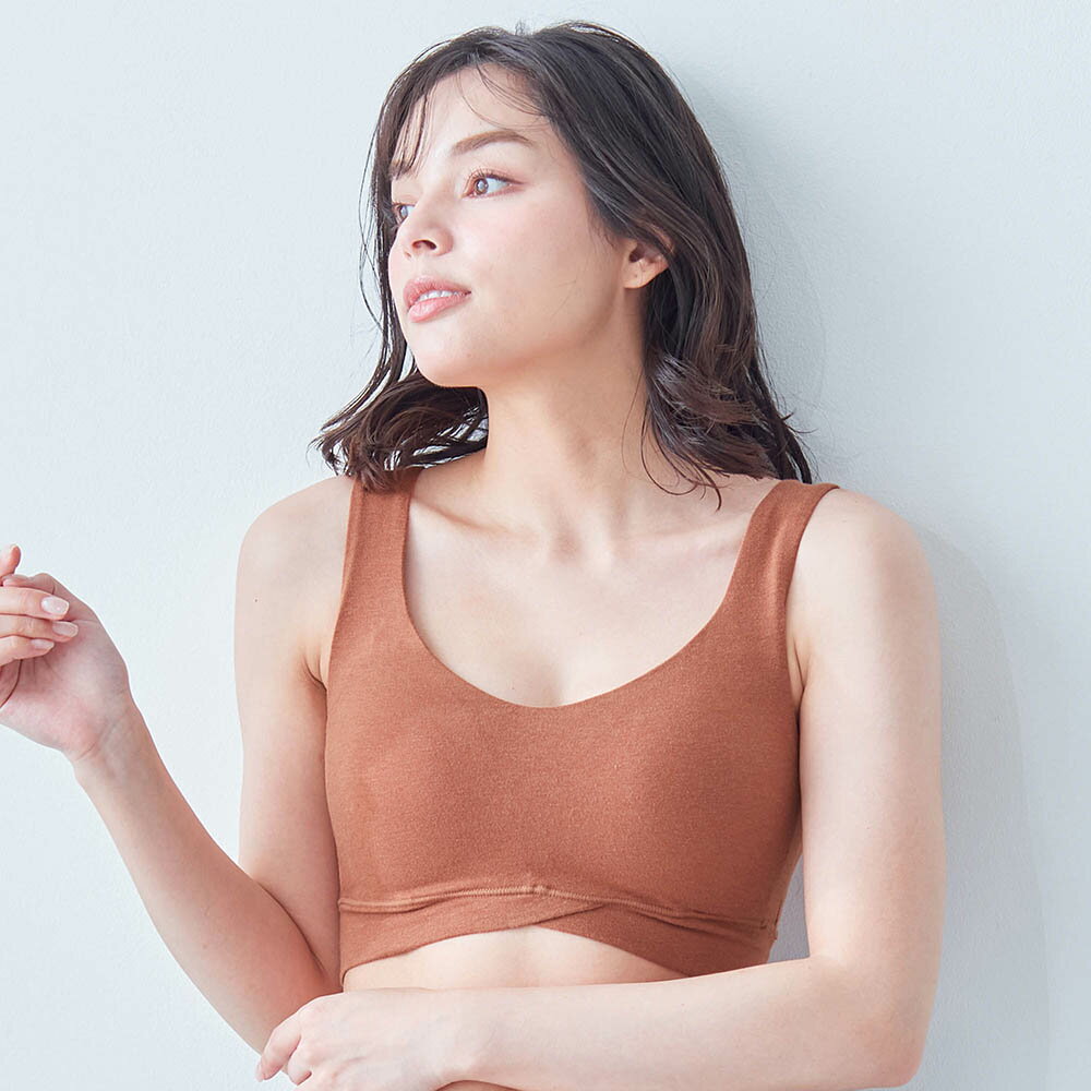 ▼ブラック ▼グレージュ ▼テラコッタ —デザイン・スタイリング— ・シンプルかつスタイリッシュ、大人女性の気分に寄り添うデザイン ・大人バストに沿う三角モールドカップで自然な美胸に ・フィット感のある生地で脇と背中のお肉を程よくカバー ・チラ見えしにくい胸元のカッティングも魅力 —素材— ・肌にやさしい綿混素材 —機能— ・カップは身生地縫い付け仕様で、カップの位置がずれにくい ・アンダーはみぞおちへの締めつけを軽減しながら日常的な動きにフィットする前側クロス構造 ●フルカップ ●ワイヤーなし ●ボーンなし ●モールドカップ使用(取り外し不可) ●綿55%、レーヨン40%、ポリウレタン5%(ストレッチ天竺) ●保湿加工 ●中国製
