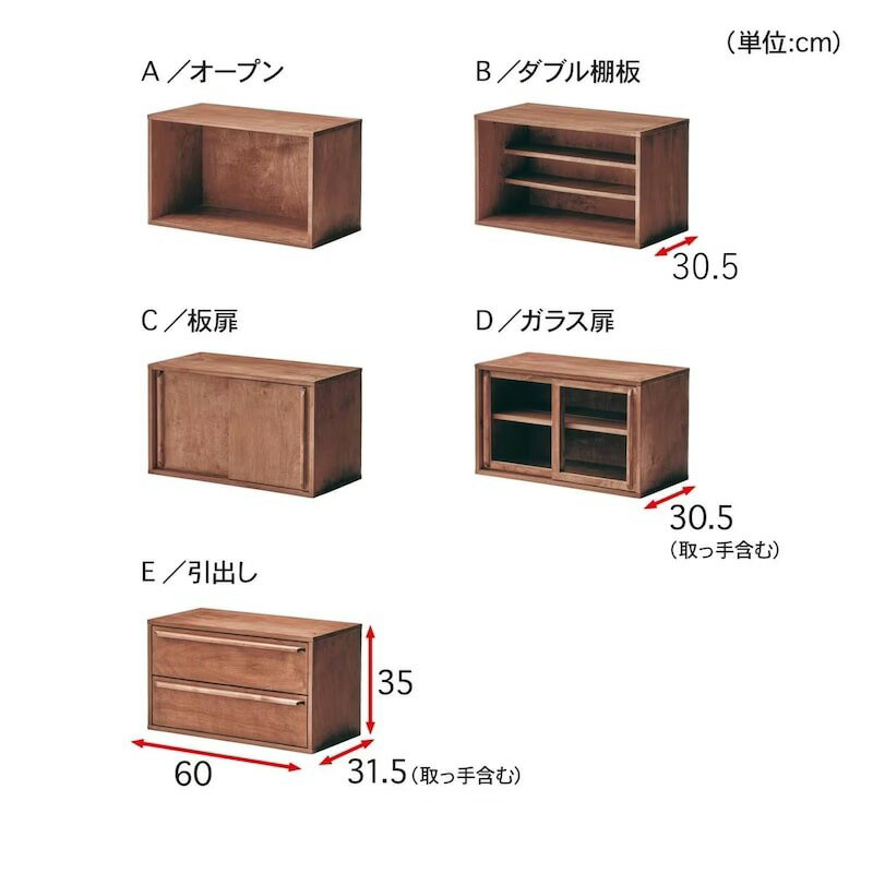 ●リビングはもちろんキッチンやカウンター下、寝室など色々な場所でマルチに活躍●味わい深い木目のカバ材に、やや黒くかすれたようなアンティーク風の塗装で仕上げています●置くだけで様になる佇まい●組み立てる必要がないから、女性でも設置が簡単変化する暮らしに方に合わせて置き場所を変えられて、長く使えます必要に合わせて買い足す楽しみもだんだんと風合いが増していくので愛著が湧きます ■A、B/幅60、奥行30.5、高さ35cm■C、D/幅60、奥行30.5(取っ手含む)、高さ35cm■E/幅60、奥行31.5(取っ手含む)、高さ35cm●耐荷重量/天板:50kg、棚板:5kg●主材/本体:天然木化粧合板(カバ材<オイルステイン仕上げ>)、取っ手・ガラス扉枠:天然木(カバ材<オイルステイン仕上げ>)、3mm厚ガラス(Dのみ)●可動棚/B・D:2枚、C:1枚●付属品/転倒防止金具(A〜Dのみ)、連結用金具2個、連結用ダボ4個●中国製 ※スタッキングは5段まで可能です。 ※Eタイプは必ず最下段でご使用ください。 ※加工の特性上、色、風合いが多少異なる事がございます。 完成した状態でお届けする商品です。一部、簡易な部品・部材(脚部など)の取り付けや連結が必要なものもあります。▼ コーディネート使用例はこちら! ▼