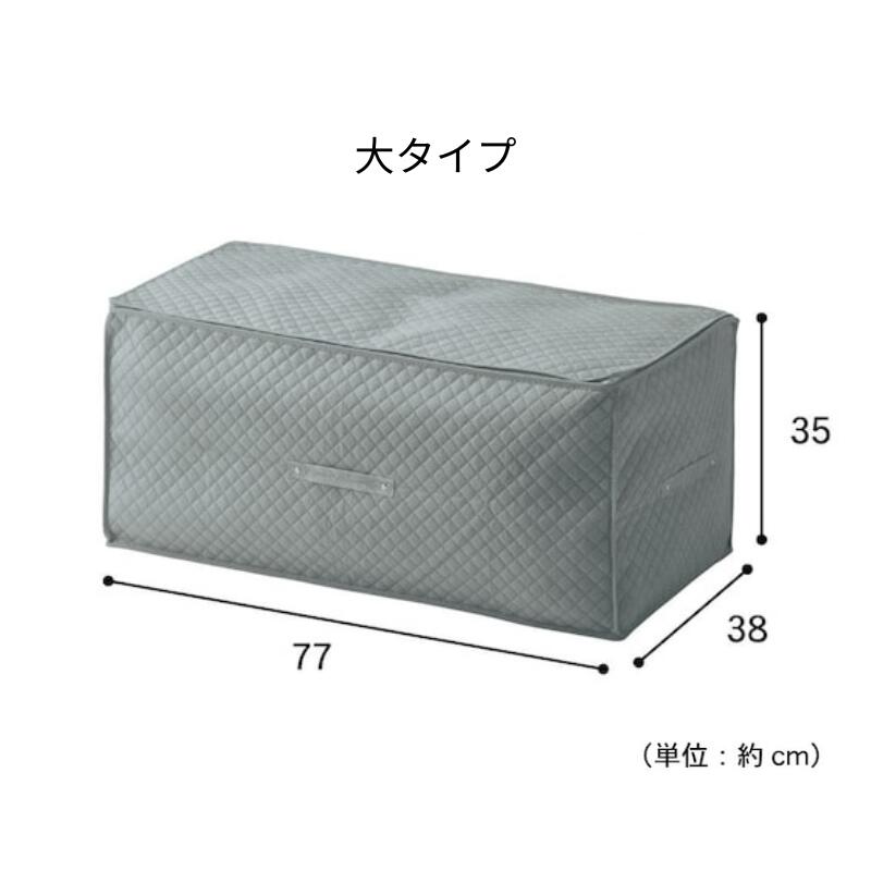 ▼アイボリー ▼グレー ◆こちらは下記サイズのページです◆ 大:幅77cm×奥行38cm×高さ35cm 厚めの生地で布団を見栄え良く収納 —機能— ・下までファスナーが開くことで簡単に布団を収納可能 ・防ダニ、抗菌、防カビ機能付き ・ダブルファスナーで左右どちらからでも開閉可能 ・前に持ち手がついているので出し入れも便利 ・布団をくるくる巻いたりたたんだりして収納可能 —素材— ・長く使える丈夫で上質な不織布素材 —デザイン・スタイリング— ・見た目もきれいなキルティング仕様 【収納量の目安】 ●小:掛け布団シングル厚手1枚あるいはダブル薄手1枚 ●大:掛け布団シングル厚手2枚あるいはダブル厚手1枚 ------------------ ■小/幅37.5cm×奥行約38cm×高さ約35cm ■大/幅77cm×奥行約38cm×高さ約35cm ●主材/不織布:ポリプロピレン(一部防ダニ剤・抗菌剤・防カビ剤練り込み・SEKマーク取得済<抗菌防臭加工>) ●ダブルファスナー仕様 ●中国製 ■シリーズ番号:10-28-803 ※コンパクトな商品のため、綿布団が入らない場合がございます。 ※裏地白不織布部分のみ「クラピュア(R)」使用。 ※こちらの商品は生地に特殊な加工が施されており、商品から薬剤の香りがする場合がございます。 その場合は、2〜3日天日干しをしていただくことで改善されます。 香りによる人体への影響はございません。 ▼サイズ違い商品はこちら▼ 小タイプ:幅37.5cm 奥行38cm 高さ35cm防ダニ・防カビ・抗菌機能が3年続くオープンラックぴったり布団収納袋は サイズ2種類 幅37.5 / 高さ35cm / 奥行38 > 幅77 / 高さ35cm / 奥行38 > 整理整頓できる収納用品カテゴリーはこちら ▶︎