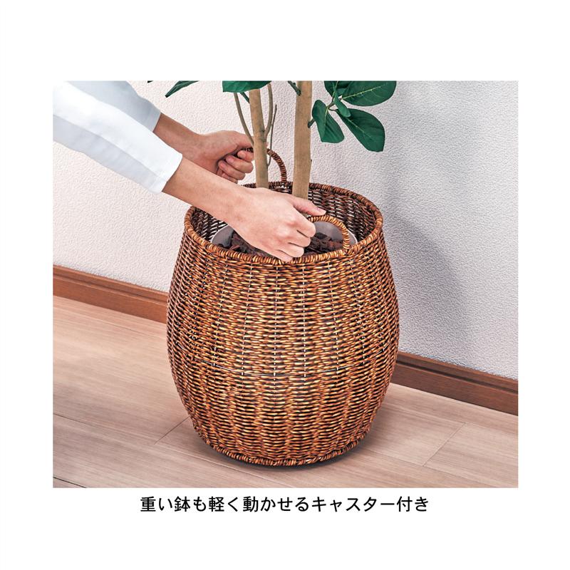 - 重さのある鉢植えもスイスイ移動! —デザイン・仕様— ・ふっくらしたフォルムと艶のあるラタン調がおしゃれな鉢カバー ・キャスター付きだからお掃除や模様替え、日当たりの調整も簡単 ・通気性のよいシンプルな構造 —素材— ・樹脂素材だから、汚れても水洗いOK! ------------------ ●本体サイズ/径約35cm(最大部)、高さ約41.5cm(取っ手・キャスター含む)●内寸サイズ/入口内径約28.5cm、内部接地面から入口縁までの高さ約29cm●主材/ポリエチレン、ポリプロピレン、18−8ステンレス●キャスター付き(内2個ストッパー付き)●耐荷重量/8kg●中国製■シリーズ番号:10-87-341 ※必ずお持ちの鉢サイズと内寸サイズを照らし合わせの上、ご購入ください。 ※ご使用の際は、鉢カバーの中に必ずお手持ちの受け皿を設置した上でご使用ください。 ※水洗いする際は、必ずキャスター部を取り外してください。