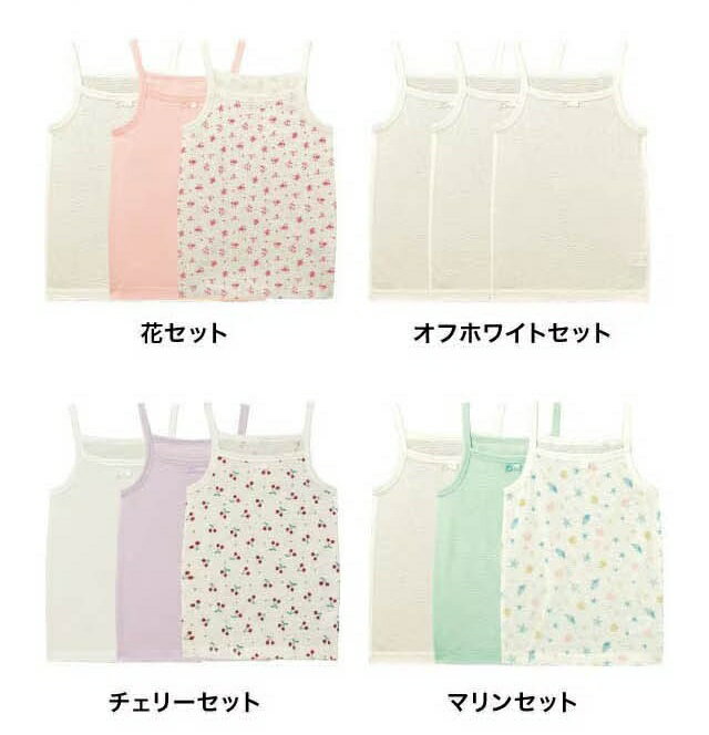 ▼オフホワイトセット ▼花セット ▼マリンセット ▼アイスセット ▼ラベンダー&サックス&オフホワイトセット ▼チェリーセット 同アイテム80〜130サイズは コチラ≫≫ 同シリーズの タンクトップ タイプはこちら≫≫ 「汗をかきやすいお子さんに快適に過ごしてほしい」 そんな思いを叶える、メッシュ素材を使用したインナー ●通気性に優れムレにくく、汗をかいてもベタつかない ●中央の愛らしいリボンがさり気ないアクセント 【ママにうれしいポイント!】 ●爽やかな着心地の、肌に優しい綿100%メッシュ素材 ●便利なお名前スペース付き ●油性ペンで直接書けてにじまず、お名前付けラクちん ●肩ひもがずれにくい、うれしい仕様 ●洗い替えに便利な同色と色柄の異なる3枚セット ------------------ (140)身丈54 (150)身丈58cm ●前:飾りリボン ●(カットソー)綿100%(メッシュ) ●ミャンマー製または中国製 ・ご家庭で洗濯ができます。洗濯機で洗っても大丈夫です。 そのほかの キッズ メッシュインナー はこちら≫≫