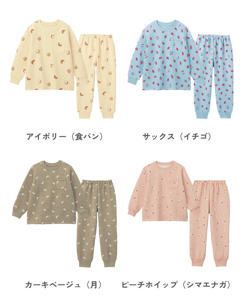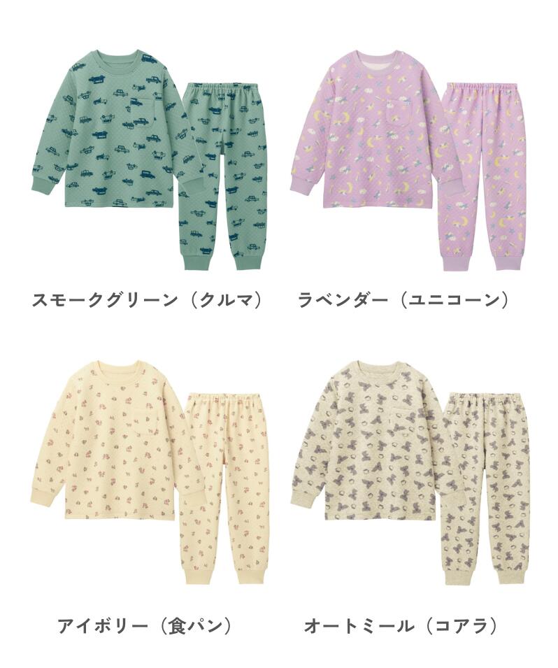 ▼スモークグリーン(クルマ) ▼オートミール(コアラ) ▼サックス(イチゴ) ▼ネイビーブルー(星) ▼アイボリー(フラワー) ▼ラベンダー(ユニコーン) ▼アイボリー(食パン) ▼ピーチホイップ(シマエナガ)【25年秋冬新色】 ▼カーキベージュ(月)【25年秋冬新色】 同アイテム 80〜130サイズはこちら≫≫ 同シリーズ 腹巻付きタイプ はこちら≫≫ 明るい総柄デザインで楽しい夢が見られそう —デザイン・スタイリング— ・のりものや動物、ユニコーンなどかわいいモチーフの総柄デザイン ・豊富なカラーバリエーションで洗い替えやお揃いも◎ ・股上深めなのでおなかや背中が出にくい ・袖口と足口はリブ仕様でずり上がりにくい ・お着替え時に間違いにくいポケットつき —素材— ・肌に触れる表・裏は綿100%素材を使用したニットキルト(リブ部分除く) ・中わた入りでふんわり安心のあたたかさ —機能— ・油性ペンで直接書ける、便利なお名前スペース2枚付き ◆GITA(ジータ) 安心して着せたいママと、毎日気持ちよく着たいコドモ。 みんなの思いと一人ひとりの成長に寄り添って。 こだわりの機能と豊富なサイズ、デザインバリエーションが魅力のオリジナルブランド ------------------ [トップスサイズ] (140) 胸囲88、肩幅35、袖丈49、身丈56cm (150) 胸囲94、肩幅38、袖丈52.5、身丈60cm (160) 胸囲102、肩幅41、袖丈56、身丈64cm [ボトムスサイズ] (140) 股下61、総丈86.5cm (150) 股下66、総丈93cm (160) 股下71、総丈99.5cm [トップス仕様] ●前:左胸ポケット [ボトムス仕様] ●ウエスト:総ゴム(取替え口あり) ●後ろ:右ポケット [セット共通内容] ●<カットソー>表側・裏側:綿100%、中わた:ポリエステル100%(ニットキルト)、リブ部分:<カットソー>綿95%、ポリウレタン5%(リブ) ●中国製 ※柄の出方が多少異なることがあります。 ・ご家庭で洗濯ができます。洗濯機で洗っても大丈夫です。 そのほかの ニットキルト パジャマ はこちら≫≫ そのほかの あったかパジャマ はこちら≫≫