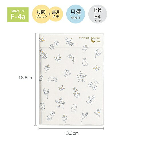 こちらのページは B6 本体サイズ H188×W133×D6mm 月曜始まり のご注文ページです。サイズのお間違えにご注意ください。 ※こちらの商品は2026年版の商品になります。※ 当店の販売開始日:2025年8月4日(月) 入荷次第順次発送となります。 年号、数字、曜日など以外の仕様変更はありません。 【2026年日付入り手帳】 ●編集タイプ「F-4a」 ●B6サイズ 【カレンダーページ】 ・月間スケジュール:2025.12~2027.3 【ページ数】64ページ 【サイズ】本体サイズ/H188×W133×D6mm 【材 質】(表紙カバー)透明PVC、(挿入紙)紙 【特 徴】見出し補強シール付き・外ポケット付き 【コンテンツ】 ・年間カレンダー ・年間計画表 ・毎月メモ ・病院/お薬メモ/パスワード番号リスト/お金の管理メモ ・年齢早見表/お誕生日メモ/贈答品リスト ・災害時の連絡ガイド/家族の連絡先メモ ・防災の備えリスト/緊急時の連絡先メモ ・テレフォンガイド/郵便料金表 ・ 【備考】 ●異なるタイプ(4月始まり、9月始まりなど)は発売予定はございません。 ●写真は使用見本となりますので、付せん、ペン等の小物は付属しておりません。 ★★★ 過去の同じシリーズ ★★★ ※表紙のデザインは出版年によって変更があります。 2025年版 113SH 2024年版 090SH 2023年版 066SH ↓↓↓下の手帳はイメージです。仕様の見本です。 ご一緒にいかがですか