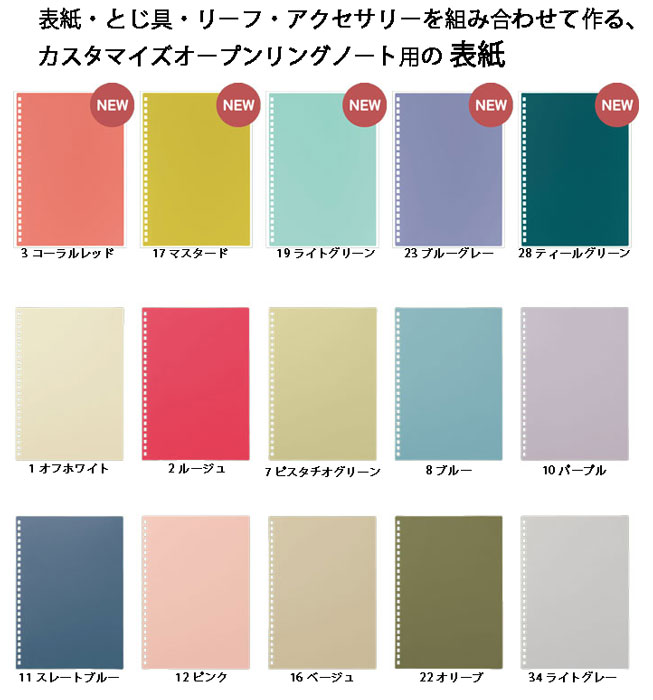 カスタマイズ オープンリングノート << 表紙 A5 >> こちらの商品のみではご使用いただけません。 国際標準 1/3インチ(8.47mm)ピッチ 角穴の オープンリングノート・ツイストノート<適合リーフ>A5の罫内容からお好きなリーフをお選びいただき、 専用のオープリングリングノートとじ具 にセットして カスタマイズをおたのしみながらご使用ください。 一般のバインダーノート用のリーフとは互換性がありません。 表紙・とじ具・リーフ・アクセサリーを組み合わせてオリジナルノートが作れる、カスタマイズオープンリングノート用の表紙。 1枚バラ売りのため、おもて・うら表紙で異なる2色お選びいただくことも可能です。 【サイズ】A5 S型 【穴 数】24穴 【幅・高さ】149mm×212mm 【材 質】本体 ポリプロピレン(生地厚0.85mm) 【品番・色・JAN】 N-2900-1 オフホワイト 4903419360795 N-2900-2 ルージュ 4903419360801 N-2900-3 コーラルレッド 4903419360818 N-2900-7 ピスタチオグリーン 4903419360832 N-2900-8 ブルー 4903419360849 N-2900-10 パープル 4903419360856 N-2900-11 スレートブルー 4903419360863 N-2900-12 ピンク 4903419360870 N-2900-16 ベージュ 4903419360894 N-2900-17 マスタード 4903419349929 N-2900-19 ライトグリーン 4903419349936 N-2900-22 オリーブ 4903419360900 N-2900-23 ブルーグレー 4903419349943 N-2900-28 ティールグリーン 4903419349950 N-2900-34 ライトグレー 4903419360924 ★写真は使用例です。小物は付属しておりません。 ★商品写真はサンプルのため、画像の色及び柄と現物とでは若干の差異が生じます。予めご了承ください。 ★メーカー予告なく販売完了となる場合がございますので、その際はご了承お願いいたします。 ■ A5 カスタマイズアイテム ■ 適合アイテム ↓↓↓↓ オープンリングノート・ツイストノート<適合リーフ>A5 ↓↓↓↓ ※こちらの商品は、メール便対応可能商品です。 アクセサリーを1冊、専用ノートを1冊、他ルーズリーフを1~2点、筆記具数本を含めても メール便対応可能です(A4サイズ3cm厚程度以内で1,000g以内) 極力1通での配送となる様、当店でも努めておりますが、ツイストノート数冊や、 他商品同梱、GIFT包装などでメール便1通の対応可能サイズを超えてしまう場合は、 メール便複数通もしくは宅急便での配送へ変更させていただく場合がございます。 予めご了承願います。
