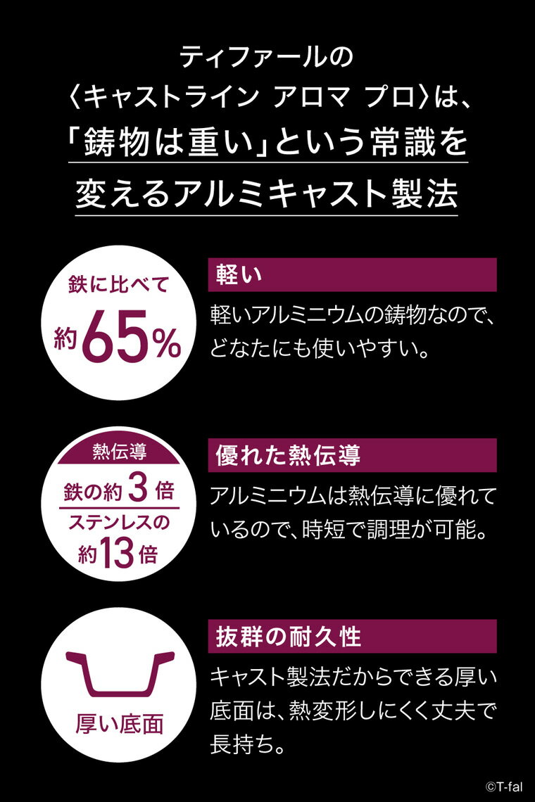 商品詳細 キャストライン アロマ プロ シャローパン 28cm SPEC ●内容量:本体、ガラスぶた ●本体サイズ・重量(約): 幅39.5cm×奥行き30.8cm×高さ(ふた込み)17.3cm、本体の高さ9.4cm、重量(ふた込み)2,450g、満水容量4.5L ●素材・材質: 【本体・取っ手】アルミニウム合金 【底】アルミニウム合金+ステンレス鋼(クロム16%) 【ふた】強化ガラス 【ふたつまみ】フェノール樹脂 ●箱サイズ:約 横41.1×縦33.1×高さ14.1cm T-fal(ティファール)について 1956年にフランス・パリの郊外の町で誕生し、世界で初めて「こびりつきにくい」(=ふっ素樹脂加工)フライパンを発明したティファール(株式会社グループセブ ジャパン)。伝統と革新を併せ持ち、世界約150ヵ国で愛されています。 "毎日の家事をもっと楽しく、もっとラクに!"人気商品「取手の取れるフライパン」や、すぐにお湯が沸かせる定番の電気ケトルなどロングセラー商品をはじめ、簡単においしい料理がつくれる使いやすい圧力鍋や電化製品・調理器具を取り揃えています。取っ手のとれるシリーズでは、フライパンやお鍋を狭いスペースでもスマートに収納できるうえ、冷蔵庫やオーブンにそのまま入れられるのも便利です。シンプルでスタイリッシュなデザインも魅力。 ティファールで快適なキッチンライフを!毎日使える調理器具は、ご自宅用だけでなく、新生活を始めるご家族・ご友人へのプレゼントとして、引っ越し祝い・結婚祝いのギフトにもおすすめです。商品情報 頑丈なチタン・フォースコーティングにリニューアル。 煮るも焼くも自在な人気の浅型タイプはマルチに活躍! 浅めのシャローパンは、さまざまな調理にマルチに活躍。 「煮る」も「焼く」もおいしく仕上がります。 蓄熱力が高いので、冷めにくく、卓上での鍋料理等に便利です。 ふたは、湯切りができる便利な自立式。 【コーティングが進化】 ・頑丈なチタン・フォースコーティングになり、使いはじめのこびりつきにくさが長続きします。 【新しくなった「お知らせマーク」】 ・食材を入れるベストなタイミングが分かる「お知らせマーク」が新デザインに。さらに分かりやすくなりました。 【すばやい熱伝導と優れた蓄熱性を兼ね備えたアルミキャスト製法】 ・アルミの持つ優れた熱伝導で、ムラなく全体を素早く加熱します。 ・高い蓄熱力で、温度が下がりにくいため、素材の味をじっくり引き出します。 ・鉄に比べて約65%軽いアルミキャスト製法だから、軽くて使いやすい。 <注意事項> ・IH(電磁調理器)・ガス火を含む、いずれの熱源にも使えます。 ・金属へらも使えます。(角の丸いものをお使いください) 【食洗器】可 食器洗い機をご利用される場合は、食器洗い機、およびご使用される洗剤の取扱説明書や使用上の注意をご確認のうえ、従ってください。 アルカリ性の洗剤をお使いになられるとアルミニウム合金が腐食し、はり底がはがれることがあります。 SERIES 人気のカテゴリから探す T-falのすべての商品を見る