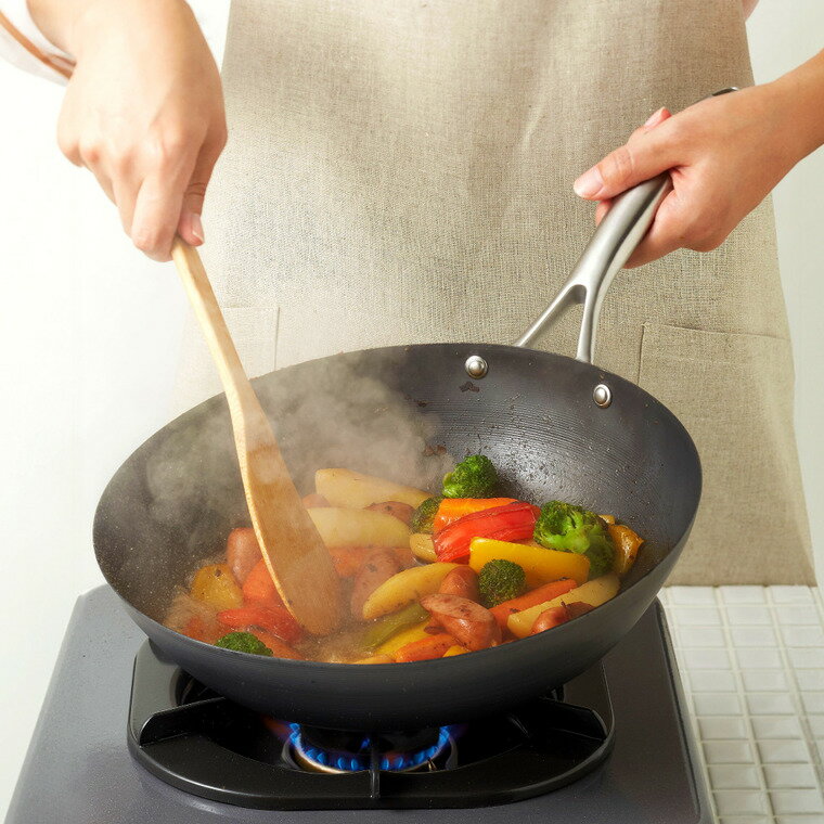 商品詳細 ビタクラフト スーパー鉄 ウォックパン 28cm SPEC ●本体サイズ(約):内径28cm、深さ7cm、底径17.5cm、板厚1.6mm ●本体重量:1099g ●素材・材質:本体/鉄(窒化加工)、ハンドル/ステンレススティール ●生産国:日本 ●対応熱源:熱源は選びません。(ガス・IH(電磁調理器)対応) ●箱サイズ:約 幅47.5×奥行29×高さ13.5cm 機能説明 ■お手入れ簡単、鉄製のウォックパン 窒化加工により、鉄の魅力はそのままで錆びにくい「スーパー鉄」のウォックパンが完成しました。鉄製なのに、調理後はぬるま湯で洗うだけでお手入れ完了。油ひき不要でお手入れも簡単です。強度が高く変形しにくいため、ガス火はもちろんIHやキャンプでの焚き火調理も可能。高温のまま短時間で調理できるので、いつもの食材もさらに美味しく仕上がります。 ■全ての工程が安心の日本製 本体の成形から窒化加工、最終検品まで全て一貫して日本国内で行っています。表面に凹凸があるのがスーパー鉄シリーズの特徴。凹凸が油の吸収性を高め、チャーハンはパラッと、炒め物はシャキッと。使うほどに油がなじみこびりつきにくく、お料理が美味しく仕上がります。本体の材料は鉄だけなので、金属製のキッチンツールやヘラの使用もできます。 VitaCraft(ビタクラフト)について ビタクラフトの社名は、素材の栄養と美味しさを活かすためのビタミン(ビタ)を逃さない手作り(クラフト)の調理器具が由来。「世界最高級の調理器具メーカー」として、健康的な暮らしを支える調理器具を世界中の家庭に届けています。 長く使える鉄製の調理器具は、ご自宅用だけでなく、新生活を始めるご家族・ご友人へのプレゼントとして、引っ越し祝い・結婚祝いのギフトにもおすすめです。お手入れ不要の「スーパー鉄」でいつものお料理をより美味しく ビタクラフト スーパー鉄ウォックパン28cm 窒化加工により、鉄の魅力はそのままで錆びにくい「スーパー鉄」のウォックパンが完成しました。鉄製なのに調理後はぬるま湯で洗うだけでお手入れ完了。強度が高く変形しにくいため、ガス火はもちろんIHやキャンプでの焚き火調理も可能。高温のまま短時間で調理できるので、いつもの食材もさらに美味しく仕上がります。 鉄なのに錆びにくい「スーパー鉄」のウォックパン 錆びが大敵の船舶や航空機に使われる加工技術を応用し、鉄の内部に窒素を浸透させ表面強度を高めた「スーパー鉄」。この独自の窒化4層加工により、鉄の弱点である錆びやすさをクリアしています。 使うほど凹凸に油がなじみさらに美味しい仕上がりに ウォックパン表面に凹凸があるのもスーパー鉄シリーズの特徴。この凹凸が油の吸収性を高め、チャーハンはパラッと、炒め物はシャキッと。使うほどに油がなじみこびりつきにくく、さらにお料理が美味しく仕上がります。 本体の成形から検品まで全ての工程が安心の日本製 本体の成形から窒化加工、表面仕上、部品の取付け、最終検品まで全て一貫して日本国内で行っています。日本の優れた技術と徹底した品質管理で実現した窒化4層加工や職人の技が冴えるへら絞り加工。まさに安心のMade in Japan 品質です。 IHやガスなど、一般家庭のさまざまな熱源に対応 ガスコンロをはじめ、IHクッキングヒーター(200Vまで)から焚き火まで、さまざまな熱源に対応しています。お手入れが面倒なイメージの鉄製ウォックパンも、調理後の油ひき不要でお手入れも簡単です。 ウォックパンをもっと見る >>
