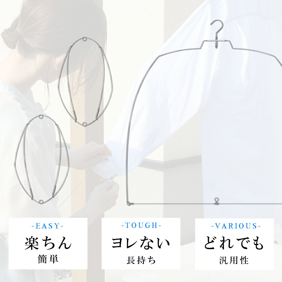 ステンレスハンガー 多機能ハンガー暮らしを変える便利グッズ! 「 BELLANE / ベラーネ 」 ▷ シワ伸ばし洗濯ハンガー ステンレスの反発力で洋服を全方向に伸ばす! 洋服のアイロンがけから解放 毎日のアイロンがけの手間を減らすため開発された、 ステンレス製の洗濯ハンガー「ベラーネ」。 ステンレスのしなり(反発力)を利用して、 衣類に対して350度のストレッチを加えて洗濯物を干すように設計。 洗濯後の濡れた状態でハンガーにかけるだけで、 Yシャツやブラウスなどシワになりやすい洋服のアイロンがけを不要にします。 日本初の機能を持った今までの物干しの常識を変える便利アイテムです。 衣類がシワシワになる原因から徹底改善! そもそも“なぜ服にシワができるのか”ご存知でしょうか? 洗濯後の衣類にシワが残る最大の原因は『シワが入ったままの乾燥』です。 洗濯が終わった後は、洗濯物どうしで絡まり、 捩じれ合う事で事で衣類にシワが入ってしまいます。 そして、そのシワが残ったまま衣類が乾いてしまう事で、 シワが入ったまま衣類の繊維が固まってしまいます。 洋服にシワが出来る原因を根本解決! 言い換えるならば、 シワが出来る前に予防する「洗濯ハンガー」です。 錆に強いステンレス製で半永久的に使用可能! 独自のテンション構造により、 あなたの衣類を干すたびに美しく整えます。 強度が高く雨ざらしされても錆にならない ステンレスを使用する事で半永久的にご使用いただける製品です。 安心して使える信頼の品質で、 毎日の家事にゆとりと心地よさをプラスしませんか。 Merit BELLANEの魅力 難しい工程は一切必要なし ハンガーにかけるだけでシワが取れる How to useベラーネの使い方 洗濯後、濡れた状態から優しくゆっくりとテンションを掛ける事で 生地に負担をかけずシワ伸ばしをしてくれます。 Bellaneのハンガーは大きく分けると、 ボディー用・アーム用・ボトム用と3つのパーツがあります。 各パーツを使用して衣類を干す事で、 シワを伸ばした状態で乾燥させることが可能です。 Unisex オンオフ兼用 それぞれの洋服の横幅に合わせてオーバーサイズトップスからYシャツまで 最近多くなってきているオーバーシルエットのアイテムから、細身のYシャツ、変形ブラウス、ジャケット、スラックスまでお使い頂けます ※サイズチャートがあるのでサイズはそちらをご参考にしてください。 幅広いカテゴリーのアイテムに対応できるので、洋服の種類に応じて何パターンもそろえたり、買い替えたりする必要性がありません。 SPEC製品の特徴 品番 ベラーネシワ伸ばし洗濯ハンガー 詳細 生産:日本製素材:ステンレス鋼 ラバー部分:シリコン(PVC) サイズ Sサイズ(ボディー用Sサイズ / アームMサイズ) Mサイズ(ボディー用Mサイズ / アームMサイズ) Lサイズ(ボディー用Lサイズ / アームLサイズ) ラッピングをご希望の場合はリボンを付けて発送させていただきます。 ご注文フォームでラッピング(165円)の指定をお選びくださいませ。 ※ラッピング用リボンはデザインの変更がある場合がございます How to choiceサイズの選び方 Product Type製品の種類 フルセット(ボディー・アーム2本・ボトム2本) ボディーセット(ボディー・アーム2本) ボディー単品 アーム単品(2本入り) ボトム単品(2本入り)
