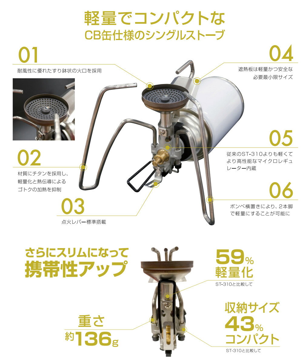 セット内容 1)SOTO レギュレーターストーブ TriTrail ( トライトレイル ) ST-350 【メーカー保証】1年間 【付属品】収納ポーチ 【生産国】日本 2)SOTO カセットガス CB TOUGH220 ( シービー タフ ) ST-712 1本 1)SOTO レギュレーターストーブ TriTrail ( トライトレイル ) ST-350 ● ST-310と比較すると、約42%の収納サイズを実現。 持ち運びが便利になり、携帯性やパッキング性に優れています。 ● 従来のST-310よりも小型軽量でより高性能なマイクロレギュレーター内蔵。 ● 耐風性に優れたすり鉢状の火口を採用。 ● ゴトクの材質はチタンを採用。 本体の軽量化をするとともに、熱伝導の低さからゴトクの加熱を抑制しヤケドのリスクを低減します。 ● ボンベ横置きにより、2本脚で軽量にすることが可能に。 ● 点火アシストレバー標準装備。 ● 遮熱板も軽量化のため、必要最小限かつ安全なサイズに設計しました。 ● 収納性・携帯性もアップ ゴトクが3本になったことで収納時もよりスリムに。 ST-310と比較して収納時の幅が42%コンパクトになりました。 ● 収納ポーチの素材はタイベックを採用。 耐水性、強度、安全性に優れています。既存製品のST-310とST-340はサイズ的に収納できませんが、ST-330は収納可能です。 製品サイズ 幅138×奥行156×高さ111mm (使用時・本体のみ) 幅112×奥行47×高さ113mm (収納時) 重量 135g(本体のみ) 材質 バーナー/器具栓つまみ/点火レバー:ステンレス ゴトク:チタン ボンベホルダー/点火スイッチ:樹脂 収納ポーチ:タイベック 生産国 日本 発熱量 ※1 2.6kW (2,200kcal/h)(ST-760使用時) 2.6kW (2,200kcal/h)(ST-711使用時) 2.6kW (2,200kcal/h)(ST-712使用時) 使用時間 ※2 約1.5時間 (ST-760を1本使用時) 約1.0時間 (ST-711を1本使用時) 約1.3時間 (ST-712を1本使用時) 使用燃料 新富士バーナー製品専用容器 (ST-711、ST-712、ST-760、ST-700) 点火方式 圧電点火方式 付属品 収納ポーチ(素材:タイベック) 耐荷重 2kg ※1 気温25℃無風状態で点火後から5分間の燃焼データより算出。 ※2 気温25℃無風状態で点火後から30分間の燃焼データより算出。 ・PSマークの種類:PSLPGマーク ・届出事業者名:新富士バーナー株式会社 ・登録検査機関名:JIA(日本ガス機器検査協会) 2)SOTO カセットガス CB TOUGH220 ( シービー タフ ) ST-712 ● 雪山でも使用可能なCB缶 ガスの成分はプロパン、イソブタン、ノルマルブタンの3種を混合。 -5℃の環境下※でも火力不足やドロップダウンに悩まされることなく、安心してご使用いただけるガス配合を実現しました。 ※ボンベ満タン時、SOTOのレギュレーター搭載の燃焼器具を使用 ● 耐圧容器について 通常の容器と比べて肉厚を厚い部品を使用することで耐圧性の高い容器となっています。 これは工業系のボンベにも使用されている実績があり、気温が高くなる夏場でも安全に持ち運べるので、年間を通して安心して登山をお楽しみいただけます。 ● OD缶と同等クラスの性能でOD缶よりも軽量 安定した炎の使用ができるOD缶は登山者に選ばれやすいですが、タフ缶であれば同じスペックでありながら、より軽量化が図れます。 ● 安全で新しい形状のボンベキャップ「Shell Cap(シェルキャップ)」 CB缶のノズルを安全に保護する新設計のボンベキャップ。 フラット形状でコンパクト、パッキング時に外れにくく、ボンベ使用時は底面に取付可能でキャップの紛失を防ぎます。 ● フラットな高さを抑えた仕様でザックの中でもキャップが外れることなく保管が可能。 ● フラットで外れにくい形状のため気づいたらキャップが外れていた、といったこともありません。 また、収納時に引っ掛かりや怪我の原因になっていた切り欠き部分をカバー。 ● OD缶と同じスペックでありながらリーズナブルに手に入れられるのも登山者にとって嬉しいポイントのひとつ。 製品サイズ 直径65×高さ186mm(キャップ含む) 重量 約334g 容量 220g 生産国 日本 成分 液化プロパン、液化イソブタン、液化ノルマルブタン