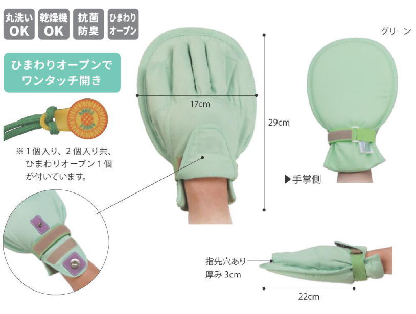 素材 側地:デニム(綿35%・ポリエステル65%) 中身:ポリエステルフェルト、ポリエステル100%立体メッシュ 重量 約135g(1個) メーカー 大阪エンゼル 【特徴】 ○手指の保護クッション ○通気性をアップさせる5フィンガー ○手のひらをひらかせるフラットタイプです。 ○ひまわりオープンでワンタッチ開閉 磁力を使ったロックシステム。 別途のひまわり型の器具を使用すれば、どなたでも簡単に開閉できます。 ○手首周り対応サイズ:約14〜20cmまで ○抗菌防臭加工 ○カラー:グリーン ○洗濯OK 脱水OK 乾燥機OK(60℃) ○左右兼用 ※画面上と実物では多少色具合が異なって見える場合もございます。ご了承ください。 ご注文受付後、通常1〜2営業日で出荷いたします。 >>片手用(1個)販売はこちら