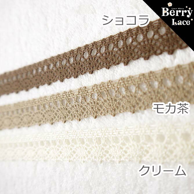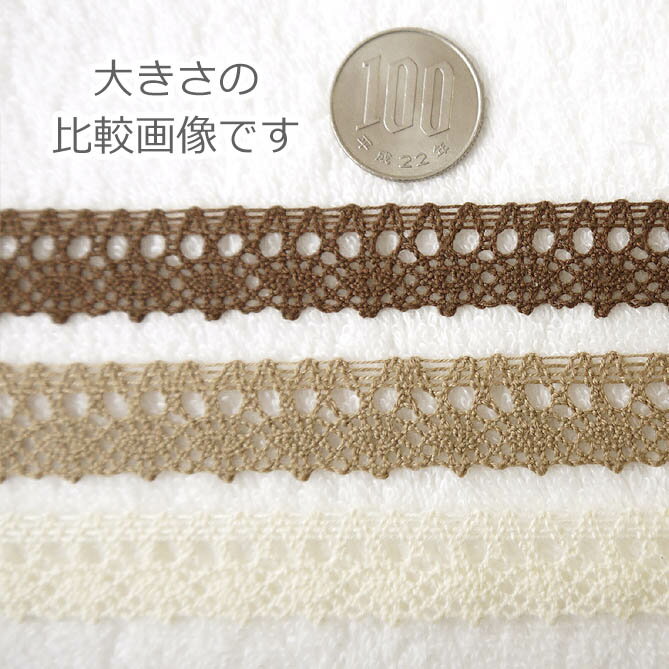 ◆ ITEM SPEC ◆ 販売単位 1パック=7m巻き ::素材:: 綿 100% ::Color:: ショコラ(こげ茶)/モカ茶/クリーム ::Size:: 約 1.6cm ::Memo: ※使いやすい定番レースです。3色からお選びください。