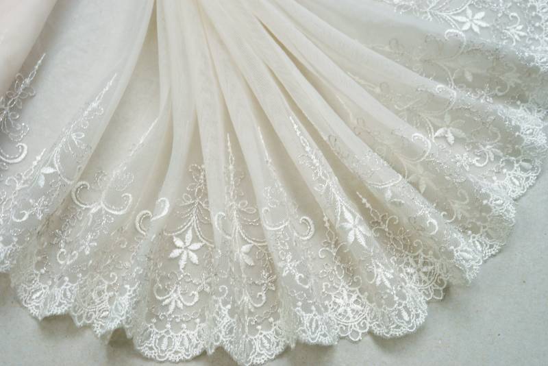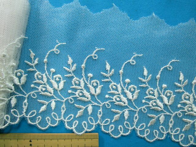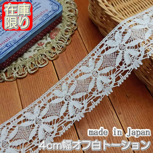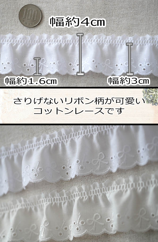 ◆ ITEM SPEC ◆ 販売単位 1パック=2m(フリル加工有り) ::素材:: 綿(コットン) 100% ::Color:: 白 オフ白 全2色 ::Size:: 約 4cm ::Memo: ※フリル加工有りのタイプです。リボン刺繍が可愛いレース(^^)同じような柄のネイビー色の商品とは幅・刺繍の感じが異なります。【重要】生産工場が変更になりました。以前より生地の質感が変わっています。