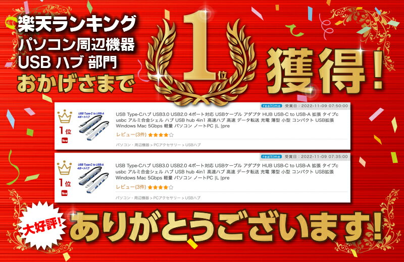 楽天1位獲得 USB Type-Cハブ USB3.0 USB2.0 4ポート対応 1年保証 USBケーブル アダプタ HUB USB-C to USB-A 拡張 タイプc usbc アルミ合金シェル USB hub 4in1 高速ハブ 高速 データ転送 充電 薄型 小型 コンパクト USB拡張 Windows Mac 5Gbps パソコン ノートPC |L |pre