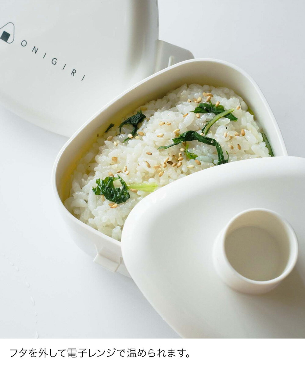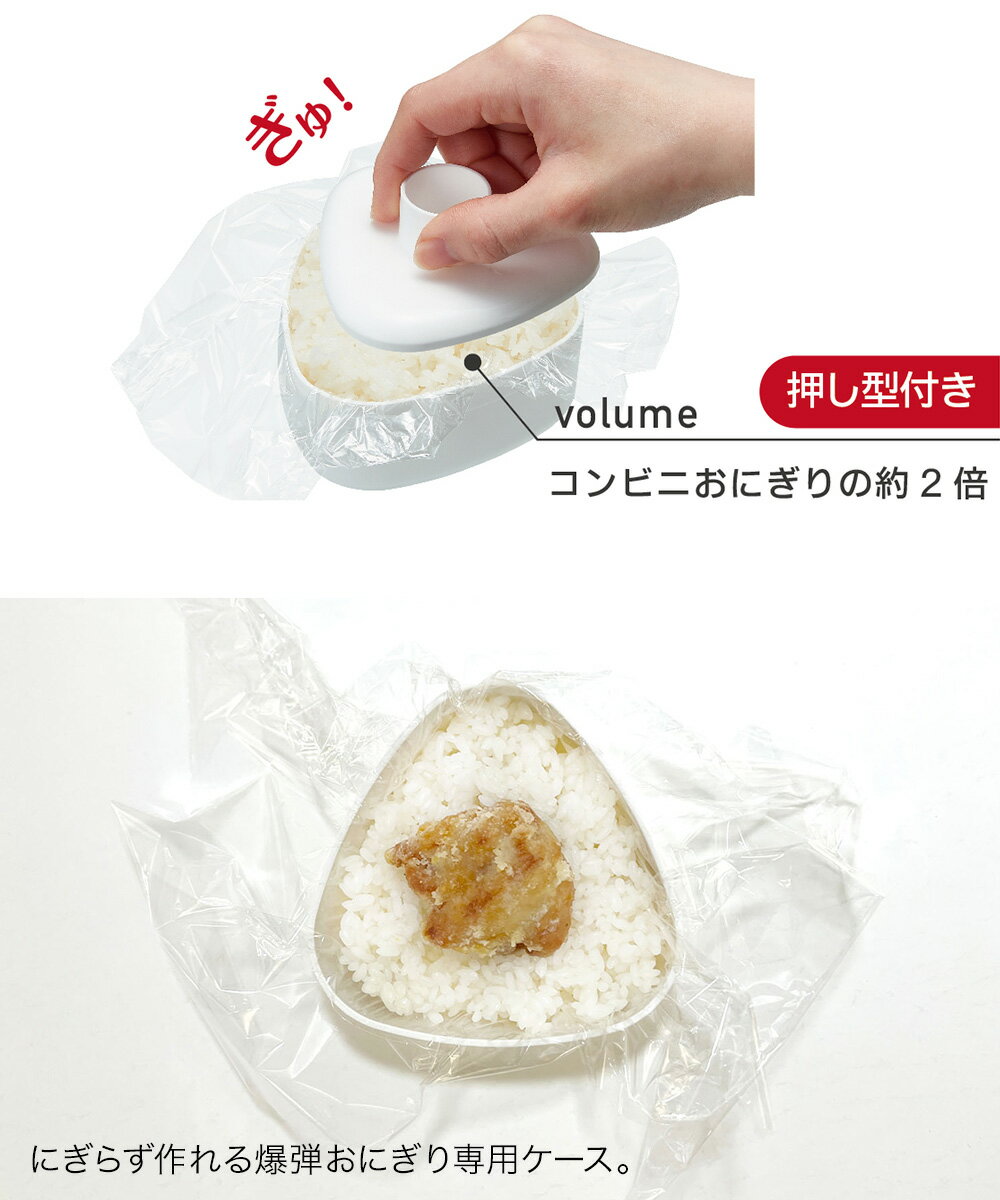 【商品について】にぎらずに作れる!そのまま携帯OK! 具だくさんの爆弾おにぎり! (コンビニおにぎりの約2倍の230g!) ラップにご飯をつつんでケースに入れると 三角おにぎりがカンタンにつくれます。 便利な押し型付き! 電子レンジにも使える携帯おにぎりケースです。 トウモロコシ由来のバイオマス原料を約10%使用! Co2排出量の削減に貢献、環境にやさしいランチシリーズです!■規格サイズ:(約)109×106×高さ56mm 容量:(約)290ml機能:本体のみレンジOK(フタ不可) 抗菌加工部分:フタ・本体・押し型 バイオマス原料使用部分:フタ・本体・押し型■材質ポリプロピレン(耐熱温度140度)■生産国日本■ご使用にあたっての注意事項・ご使用上の注意を必ずお読みいただき、正しくお使いください。 ・閲覧環境によっては色の出方が異なる場合がございます。・押し型付き・食器洗浄機・乾燥機はご使用できません。