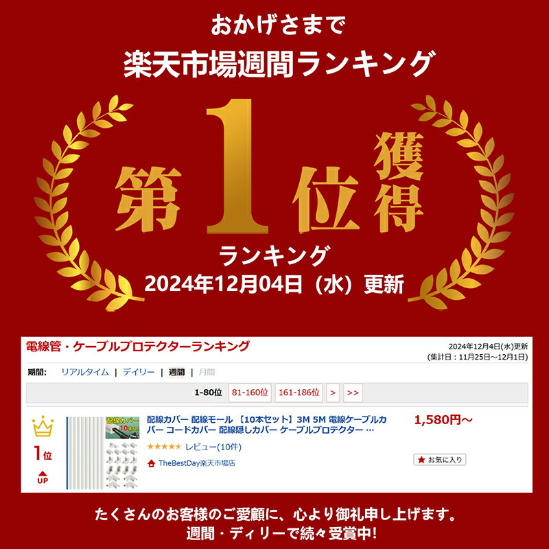 商品情報 【配線カバー 10本セット】 全長3M(30cm/本)、5M(50cm/本)。サイズ:30* 1.5 * 0.9cm、50* 1.5 * 0.9cm。壁/地面/テレビ/コンピュータ/オフィス/廊下/コンセントなどの乱雑な有線ケーブルを完璧に隠すことかできます。環境を美しくするだけでなく、電線も保護し、電力漏れの危険性を防止できます。 【配線をスッキリに・家族を守る】 テレビのケーブル、パソコンのケーブル、家電のケーブル、コンセントのケーブルなど、さまざまな有線ケーブルを完璧に隠すとかできます。お子様やペットのいたずらでケーブルが切れてしまう心配、部屋で配線がごちゃごちゃしてしまうのを一気に解決することができます。 【操作簡単】 背面カバーにはあらかじめ両面テープが貼り付けてあるため、 固定しながら作業が進められ、設置時間を節約できます。設置後も上面カバーが外せるので、長期的な使用が可能です。 【耐久性・難燃性】 コード隠しカバー葉堅牢なPVC材料で作られている丈夫で耐久性があり、 軽量で、耐摩耗性があり、高い強力な外力出ない場合に変形しにくい ケーブル管理システムは長期使用で黄ばみにくいです。着火を抑制し火災リスクを低減する難燃性効果があります。同時に安心してまた気軽にスプレーを通してあなたの家を飾ることができます。 【セット内容・品質保証】 配線カバー本体(30cm)×10本(両面テープ貼付済);配線カバー本体(50cm)×10本(両面テープ貼付済);カップリング×6個;インナーエルボー×4個;アウターエルボー×4個;フラットエルボ×4個;3wayジョイント×1個。SENUN製品は日本企業が企画開発・検品・販売・サポートを行なっております。 サドルカバーを出荷する前には、専任のスタッフが入念な検品を行います。 商品に関するご質問がありましたら、いつでもお気軽にお問い合わせくださいませ。 ■ご注意: ※サイズは若干の誤差が生じる可能性がございます。 ※製品の製造過程で静電気により少量の粉末が付着することがありますが、これは正常な現象です。気になる方はご注意ください。 ※配送中に外箱に傷や凹みが生じる場合がございますが、中身の商品には問題ございません。これらは正常な範囲内の状態とご理解いただけますと幸いです。
