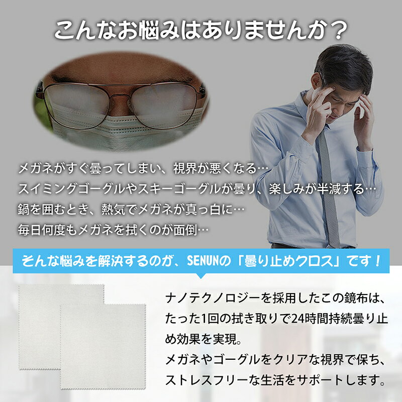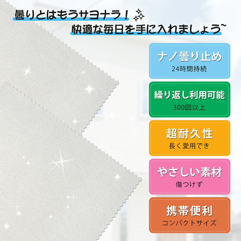 商品情報 商品特徴 【曇り止め】通勤電車や職場でのマスク着用時、熱い料理を食べる時、急激な温度変化がある場所でも、メガネの曇りをしっかり防止。特殊ナノ技術で、クリアな視界を長時間持続させます。 【5枚セットの便利さ】職場のデスク、自宅のリビング、常用カバン、車の中、ポケットなど、生活のあらゆる場所に配置可能。必要な時にさっと取り出せて、急な曇りにも即対応できます。1枚あたり300回以上使えるので、5枚セットなら長期間安心です。 【レンズを傷つけない優しい使い心地】超極細繊維の高品質素材を使用しているため、高級サングラスやカメラレンズ、時計のガラスなど、デリケートな表面でも安心してお使いいただけます。皮脂や汚れをしっかりキャッチしながら、優しく拭き上げます。 【持ち運びに便利】手のひらサイズの小ささで、財布やポケットにすっと収納可能。そのままでも清潔に持ち運べます。外出先での急な曇りにも対応できます。 【こんなシーンで大活躍】マスクを着用した通勤時、寒い外から暖房の効いた室内に入った時、熱々のラーメンや鍋を食べる時、スキー場や温泉での急な温度変化時、雨の日に傘をさして歩いている時。 メガネ曇り止めクロスの使い方 1.密封袋からクロスを取り出す。 2.レンズ表面がうっすら曇る程度に息を吹きかける(推奨) 3.クロスで10秒間、円を描くようにやさしく拭き上げる。 ※汚れがある場合は、先に通常のクロスで清掃してください。(推奨) 4.使用後はすぐに密封袋に戻し、成分の蒸発を防ぎます。 ※息を吹いて漏れがないか確認します。 ご注意事項 ※使用後は必ず手を洗ってください。 ※水分の拭き取りには使用できません。(あくまで防曇専用です) ※水洗い・長時間の水浸し厳禁(特殊成分が流れ、効果が永久に失われます) ※効果持続時間は環境により異なります。(温度・湿度・使用頻度によって変化) ※防曇効果が弱い場合→息を吹きかけてから再度拭いてください。 ※クロスが乾いた場合→霧吹きで軽く湿らせてご使用ください。(浸すのはNG) 使用回数:1枚約300回ほど セット内容:5枚セット