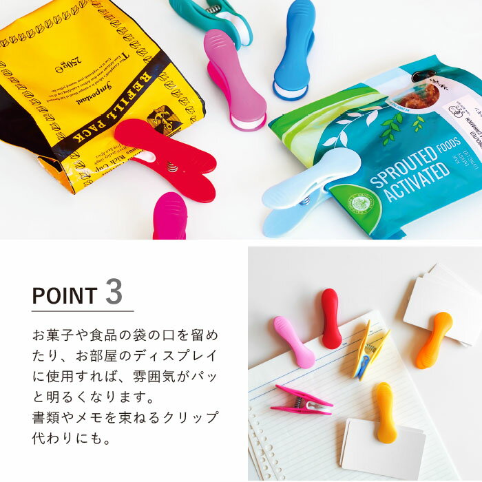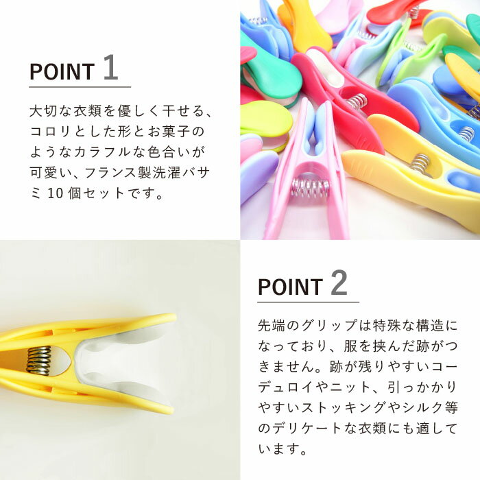 【商品概要】 大切な衣類を優しく干せる、コロリとした形とお菓子のようなカラフルな色合いが可愛い、フランス製洗濯バサミ10個セットです。 4種類のカラーバリエーションから、お好きな色をお選びください。 一番の特長は、先端のグリップ部分。 特殊な構造になっており、服を挟んだ”あと”がつきません。 洗濯バサミの跡が残りやすいコーデュロイやベルベッド、ニットにも安心してお使いいただけます。 細い繊維にもひっかかりにくくので、ストッキングやシルクなど、デリケートな衣類にも適しています。 お菓子や食品の一度開封してしまった袋の口を留めたり、ポップな色味を活かしてお部屋のディスプレイに使用すれば、雰囲気がパッと明るくなります。 書類を束ねたり、メモクリップに使ったりとオフィスシーンでも活躍します。 仕事や勉強が、少しだけ楽しくなるかもしれません。 【ご使用上・ご購入時のご注意】 ※持ち手側面には、製造過程で生じる小さな突起が見られます。 個体差はございますが製造上全てのピンチに生じるものですので、予めご了承ください。 ※長期間直射日光に当てた場合、色あせが生じる場合がございます。 ※モニターやブラウザの設定により、実物と色味が異なる場合がございます。 --------------------------- サイズ/ 約横 2.2×長さ 6.8cm 材質/ ポリプロピレン、熱可塑性エラストマー、鋼 原産国/ フランス