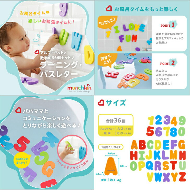 世界中の子育て家族が心から楽しめるグッズをいっぱいとどけたい。 1991年ロサンゼルスで創業し今や世界45カ国以上で愛されるブランドに成長した、マンチキン。 ポップなカラーやキャラクターがバスタイムを盛り上げるマンチキン・ワールドへようこそ! ビタミンカラーのアルファベットと数字で、バスタイムを楽しいお勉強タイムに! お風呂の壁にピタッと貼りつけて数字とアルファベットを楽しく学ぼう! 商品について 対象年齢:3歳~ アルファベット(A-Z)26コと数字(0-9)10コ、合計36コセット サイズ 1コあたり:約たて8cm×よこ6cm×厚み1cm A-Z(各1コ)、0-9(各1コ)計36コ 重さ 130g パッケージサイズ:約たて23.5cm×よこ20cm×厚さ4cm 素材 EVA 樹脂 ご注意 ・出来るだけ実物に近いお色で撮影をしておりますが、画面上と実物では多少色具合が異なって見える場合がございますご了承ください。 ・こちらの商品は日本製の商品と異なり、裁縫が甘い、小さな汚れが付着している、などの場合があります。 海外製品の基準が異なるため、当店では上記のような商品も正規品として販売しております。 詳しくはこちらから必ずご確認ください。 配送について ・こちらの商品は宅配便のみの発送となります。 ・メール便をご指定頂いても宅配便に変更の上発送させて頂きます、ご了承くださいませ。 ・日時指定をご利用の方は店舗カレンダー(ページ左)より営業日のご確認をお願い致します。 その他 ・各種ラッピングを取り揃えております、こちらより商品と一緒にご購入下さい。