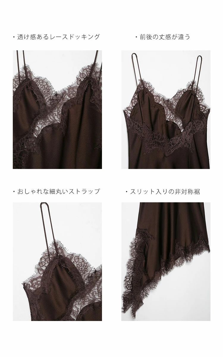 キャミソールワンピース レース サテンレース ビスチェ アシメ キャミ ロングキャミソール キャミソール サテン レースキャミ サテンキャミ アシンメトリー アシメ レイヤード 重ね着 コーデ トレンド 流行 大人可愛い きれいめ おしゃれ 黒 ブラック